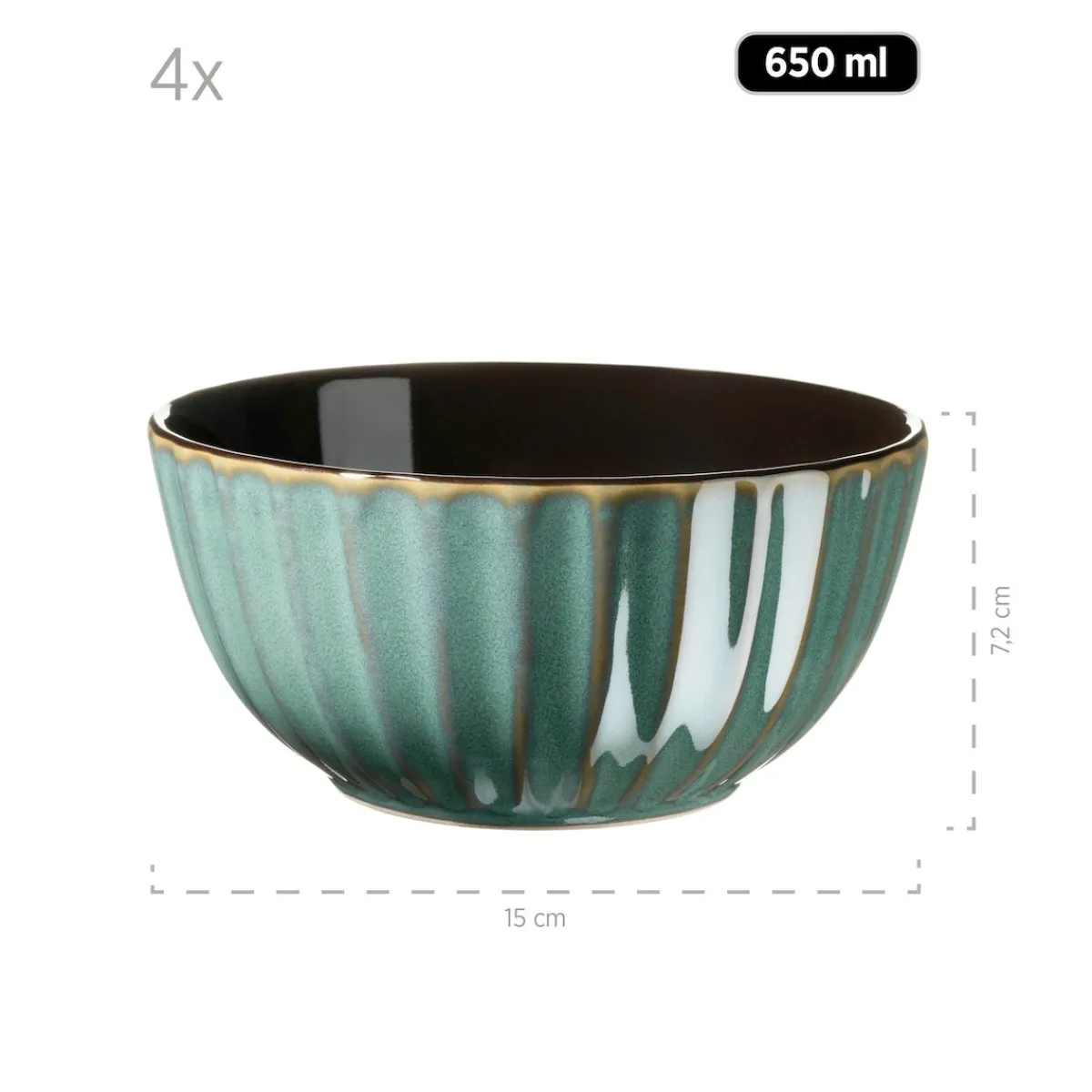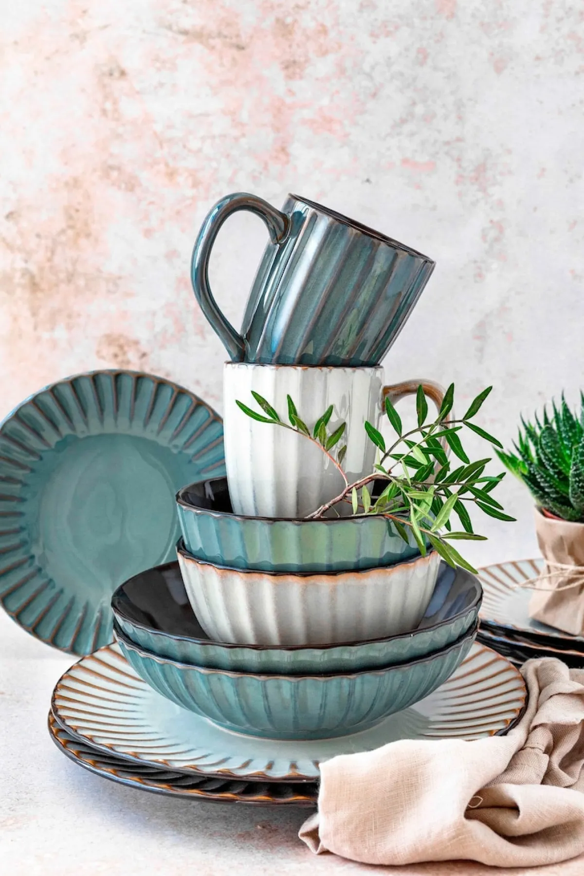 Die aufregende Kombination aus runden Retro-Formen mit Wellenrelief einerseits und einer modernen, unregelmäßigen Glasurtechnik mit schwarzen Akzenten andererseits verleiht der Tafelgeschirr-Kollektion „Confino“ eine ganz besondere Eleganz. Die Keramikgeschirr-Serie der österreichischen Traditionsmarke MÄSER wird aus hochwertigem Steinzeug gefertigt, welches nicht mit dem deutlich brüchigeren Steingut zu verwechseln ist. Die natürlich wirkenden Farbvarianten dieser Kollektion lassen sich harmonisch miteinander kombinieren. Dieses Set wird in einer vielfach auf Bruchsicherheit getesteten Paketversandverpackung aus nachhaltigen Materialien versendet. Bitte beachten Sie: Diese Kollektion wird händisch bunt lasiert, wodurch minimale Unebenheiten der Glasur, kleine Einschlüsse und leichte Farbabweichungen auftreten können. Zur besseren objektiven Vergleichbarkeit gehen unsere Füllmengenangaben von einer randvollen Befüllung aus.