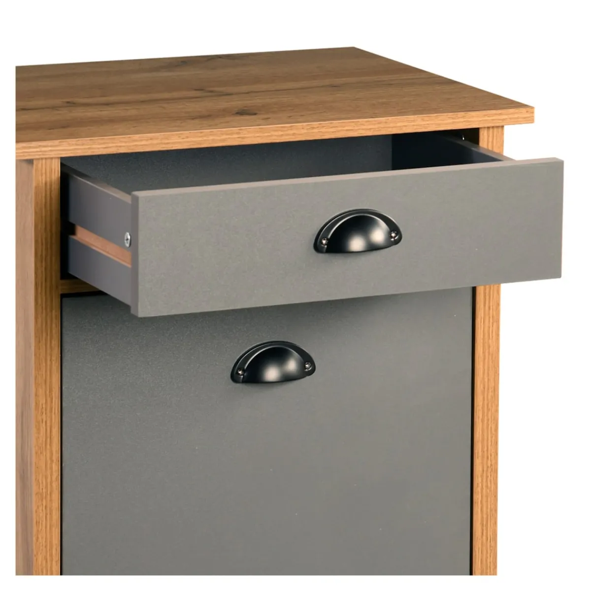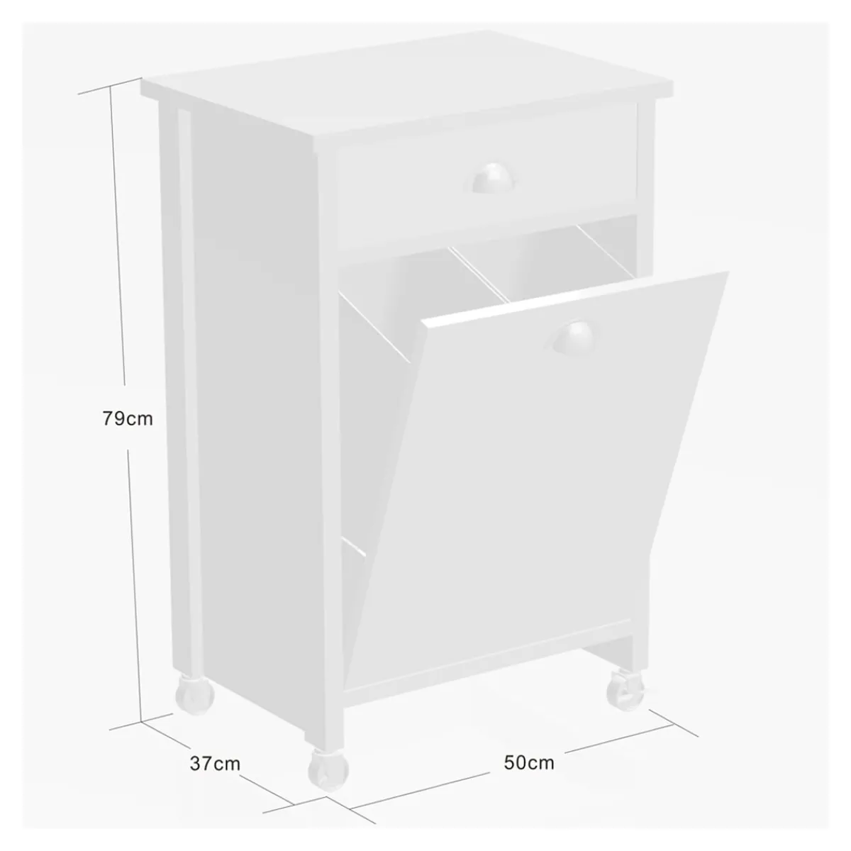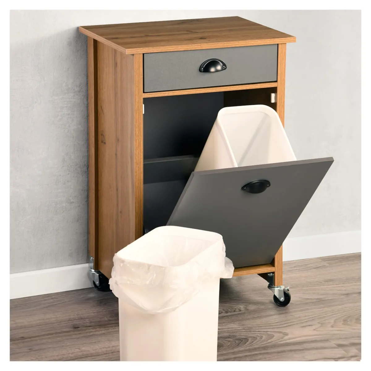 Der moderne Küchenwagen mit Mülltrennsystem schafft zusätzlichen Stauraum in der Küche. Im aufklappbaren Unterschrank befinden sich zwei herausnehmbare Abfalleimer zur Mülltrennung. Die Mülleimer besitzen ein Fassungsvermögen von je 15 Litern und sind mit Mülltütenbefestigungsringen ausgestattet. Über der Klappe ist eine Schublade angebracht, beide sind mit formschönen Metallgriffen versehen. In der zusätzlichen Aufbewahrungsmöglichkeit lassen sich Dinge wie Müllbeutel, Besteck oder andere Küchenaccessoires ordentlich und leicht zugänglich aufbewahren.