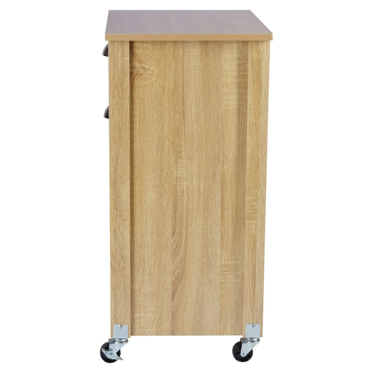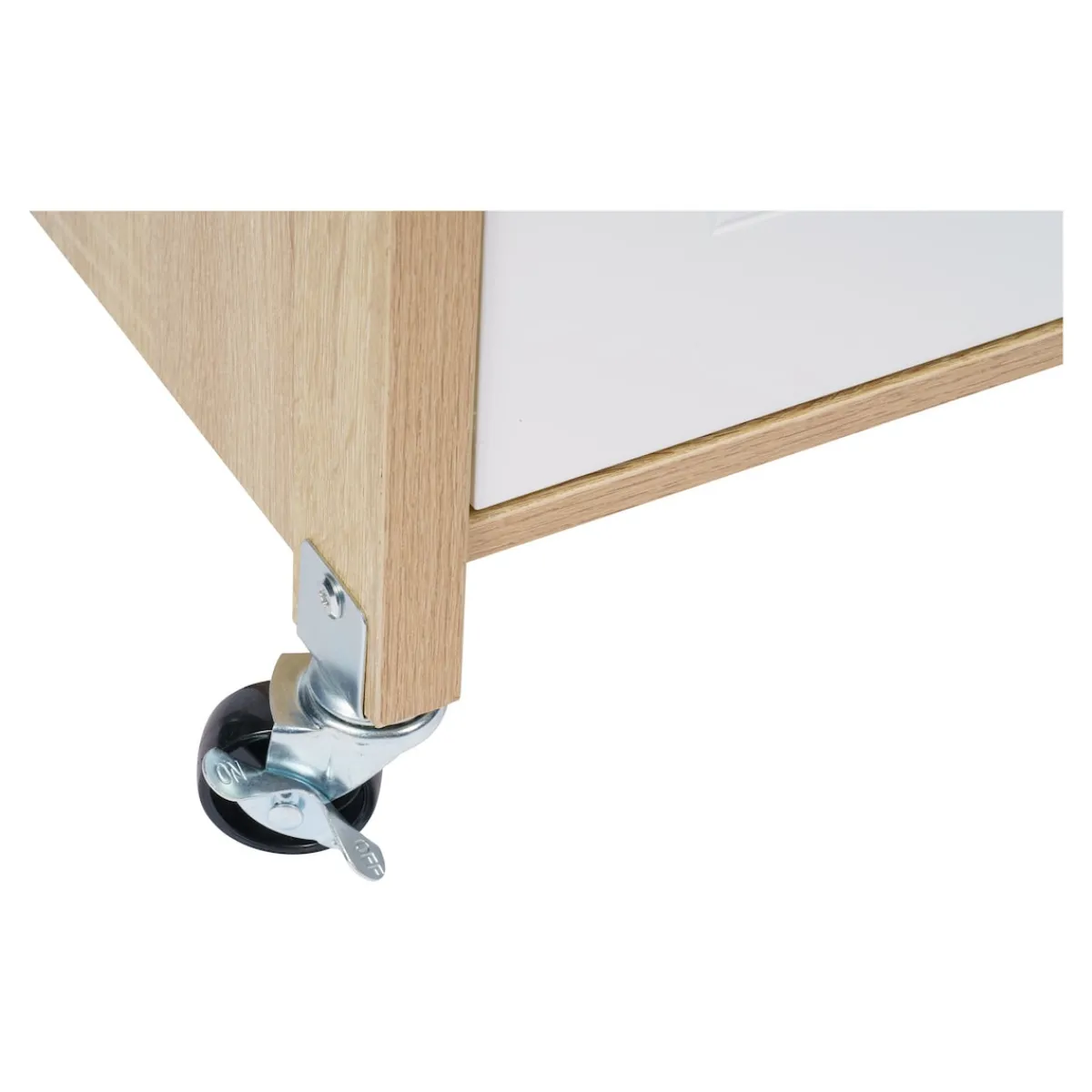 Der moderne Küchenwagen mit Mülltrennsystem schafft zusätzlichen Stauraum in der Küche. Im aufklappbaren Unterschrank befinden sich zwei herausnehmbare Abfalleimer zur Mülltrennung. Die Mülleimer besitzen ein Fassungsvermögen von je 15 Litern und sind mit Mülltütenbefestigungsringen ausgestattet. Über der Klappe ist eine Schublade angebracht, beide sind mit formschönen Metallgriffen versehen. In der zusätzlichen Aufbewahrungsmöglichkeit lassen sich Dinge wie Müllbeutel, Besteck oder andere Küchenaccessoires ordentlich und leicht zugänglich aufbewahren.