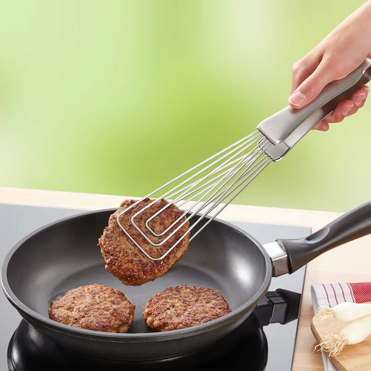 Die Küchenzange aus rostfreiem Edelstahl zeichnet sich vor allem durch ihre komfortable Handhabung aus. Verantwortlich dafür ist die extra breit gestaltete Grifffläche, die ein sicheres Wenden von Fleisch- und Fischstücken aller Art, aber auch zum Beispiel Bratkartoffeln, Pfannkuchen oder Spiegeleiern ermöglicht. Eine clevere Lösung ist die Unterteilung der Grifffläche in mehrere schlanke Streben. Auf diese Weise gibt die Küchenzange beim Packen leicht nach. Das verhindert, dass besonders empfindliches Bratgut wie zum Beispiel sehr zartes Fischfilet oder aus Hack geformte Speisen wie Frikadellen leicht auseinanderfallen. Neben ihrer Funktionalität ist die Küchenzange dank ihres minimalistischen und modernen Designs aber auch ein echter Hingucker und macht in jeder Küche eine gute Figur.