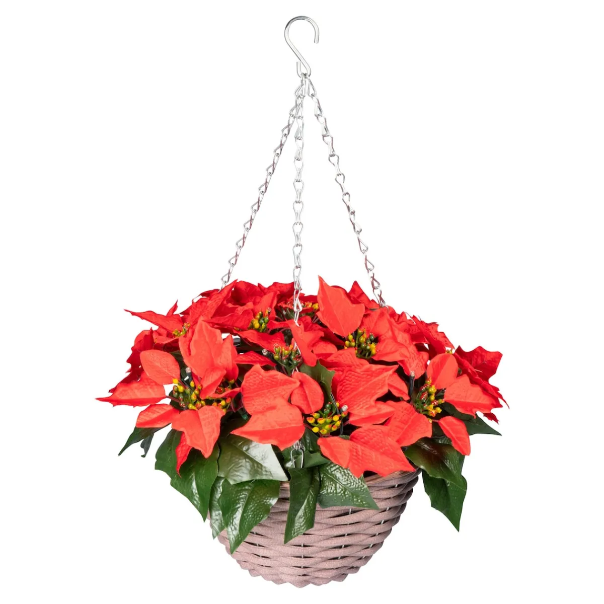Die sogar bei Dunkelheit leuchtend roten Blüten dieses täuschend echt gearbeiteten Weihnachtssterns im Hängekorb machen einfach nur Freude – und gar keine Arbeit.