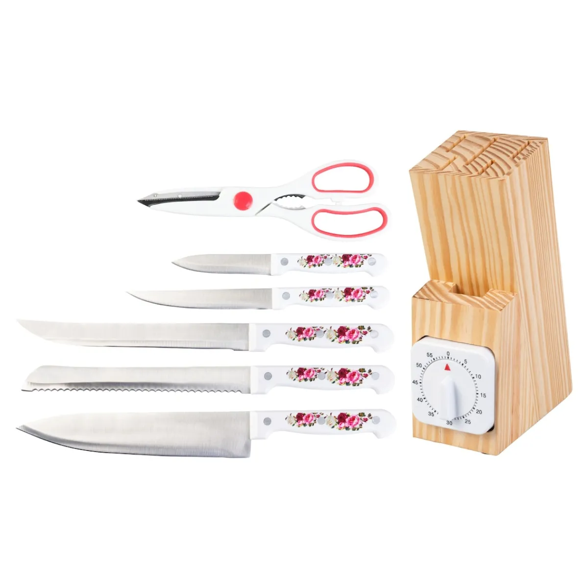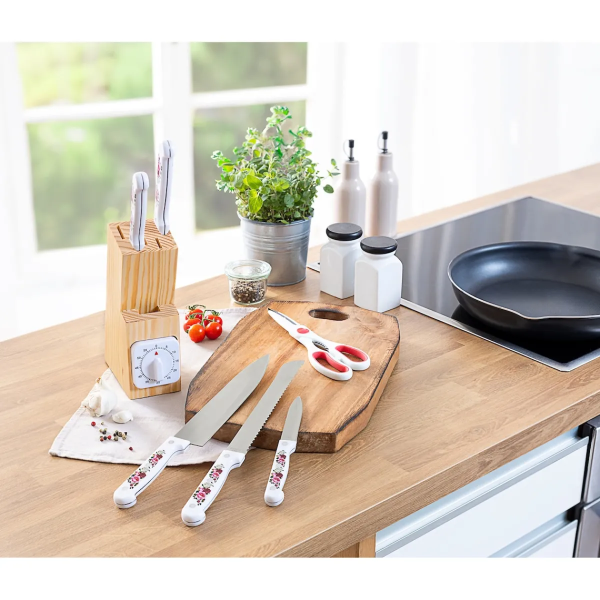 Lassen Sie Ihre Küche in voller Blüte erblühen! Dieses mit Rosen verzierte Messer-Set verbindet stilvolle Eleganz mit höchster Präzision – für Schneidekunst mit Liebe zum Detail. Mit dem perfekt abgestimmten Set aus Koch-, Brot-, Aufschnitt-, Universal- und Schälmesser sowie einer Schere zerkleinern Sie jede Zutat mühelos. Praktisch: Der stilvolle Messerblock mit integriertem 60-Minuten-Timer sorgt nicht nur für Ordnung, sondern auch für perfekte Garzeiten.