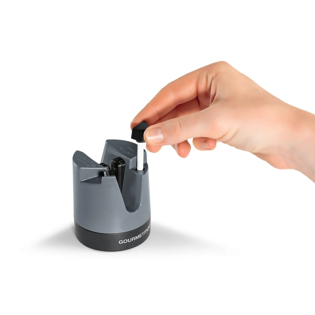 Schärfen Sie Ihre Messer und Scheren ganz bequem in Ihrer Küche. Der Messerschärfer passt für alle Klingenarten und -größen. Einfach durch die Wolfram-Schleifelemente ziehen, und der optimale Schärfwinkel stellt sich automatisch ein. Der Saugnapffuß sorgt für Stabilität. Verwenden Sie den mitgelieferten Keramik-Polierstab für den finalen Schliff. Dieser kompakte Messerschärfer findet in jeder Küche Platz und lässt stumpfe Klingen der Vergangenheit angehören. Genießen Sie wieder müheloses Schneiden.