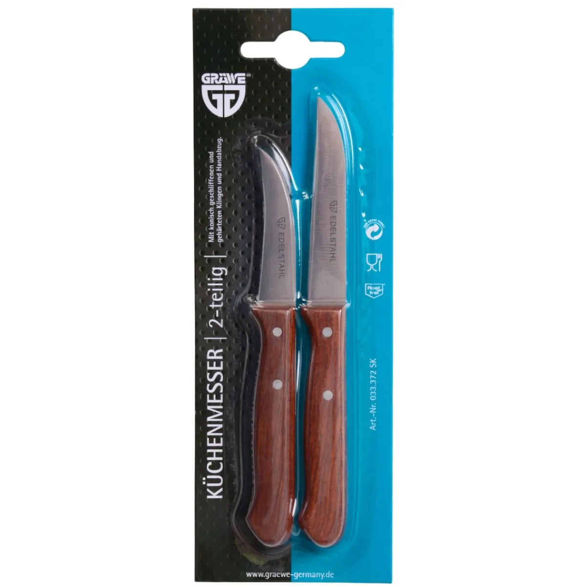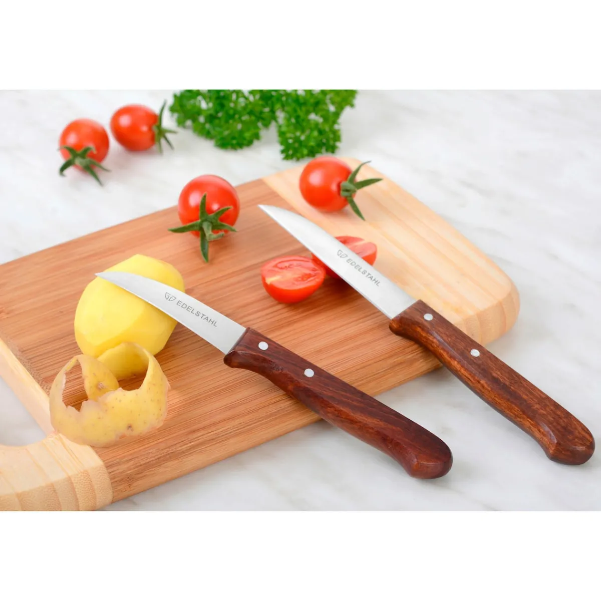 Das Messerset enthält zwei Küchenmesser mit Holzgriff zum schneiden von Obst und Gemüse.