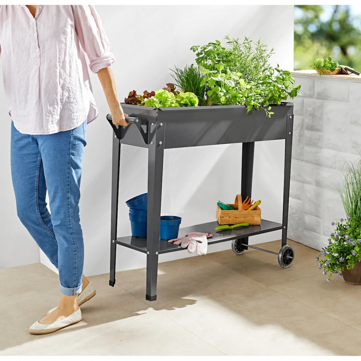 Haben Sie das anstrengende Bücken auch satt? Mit diesem Hochbeet können Sie nach Herzenslust anpflanzen, ohne Ihren Rücken zu belasten. Die unten angebrachte Ablagefläche bietet Platz für Gartenutensilien und Pflanztöpfe. Und das Beste: Mit dem Griff heben Sie das Hochbeet einfach an und verschieben es an Ihren Wunschort – zum Beispiel dorthin, wo gerade die Sonne scheint. Die weichen Kunststoffrollen sorgen für einen kinderleichten Transport.