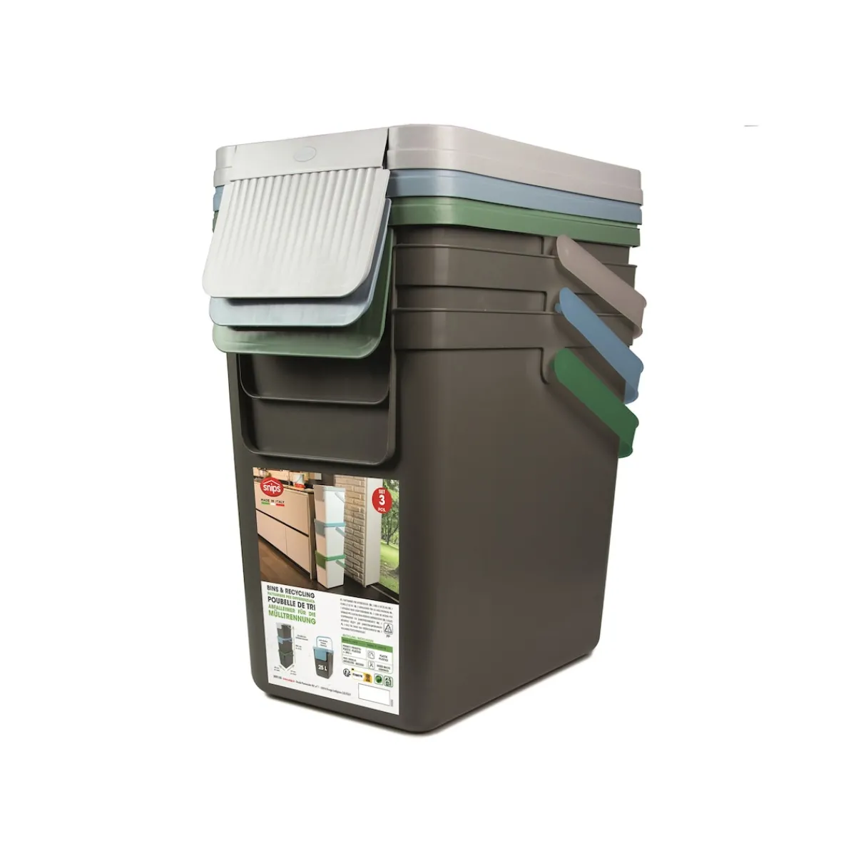Abmessungen: 3 Müllbehälter aufeinander gestapelt: (BxTxH) 26x36x100 cm
