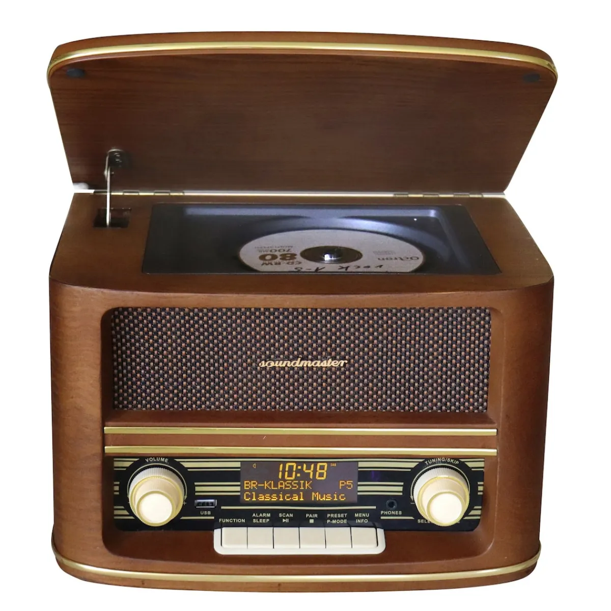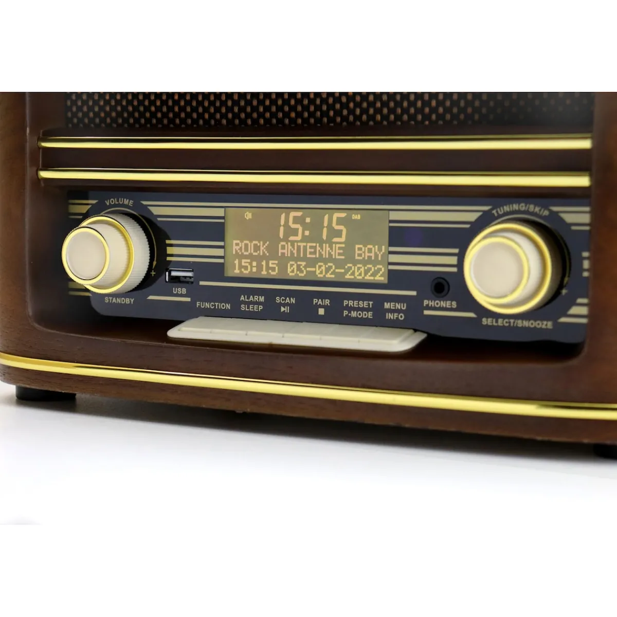 Tauchen Sie ein in die vertrauten Klänge vergangener Tage, während Sie dank modernster Technologie wie DAB+/UKW, CD/CD-R/RW, MP3, USB-Anschluss und Bluetooth®-Empfangsfunktion den Komfort der Gegenwart genießen. Mit dem 3,5 mm-AUX-IN-Anschluss erleben Sie eine unvergleichliche Verbindung von gestern und heute. Ausgangsleistung: 2x 2 W RMS.