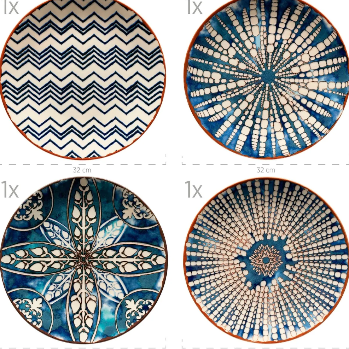 Die Keramikgeschirr Serie „Iberico Blue“ der österreichischen Traditionsmarke Mäser ist ein absolut außergewöhnlicher Blickfang auf jeder gedeckten Tafel. Überraschen Sie Ihre Gäste mit einer Zusammenstellung aus 4 unterschiedlichen Designs im maurischen Stil, die sich zu einem harmonischen Ensemble mit mediterranem Flair arrangieren. Gefertigt in Portugal aus hochwertigem Steinzeug, werden Sie an dieser mediterran anmutenden Kollektion lange Freude haben. Trotz des aufwändigen Dekors ist die gesamte Tafelgeschirr Serie „Iberico Blue“ mikrowellengeeignet, backofensicher und dauerhaft spülmaschinenfest. Dieses Service wird in einer vielfach auf Bruchsicherheit getesteten Paketversandverpackung aus ressourcenschonenden Materialien versendet. Bitte beachten Sie: Um eine objektive Vergleichbarkeit zu gewährleisten, gehen unsere Füllmengenangaben von einer randvollen Befüllung aus.