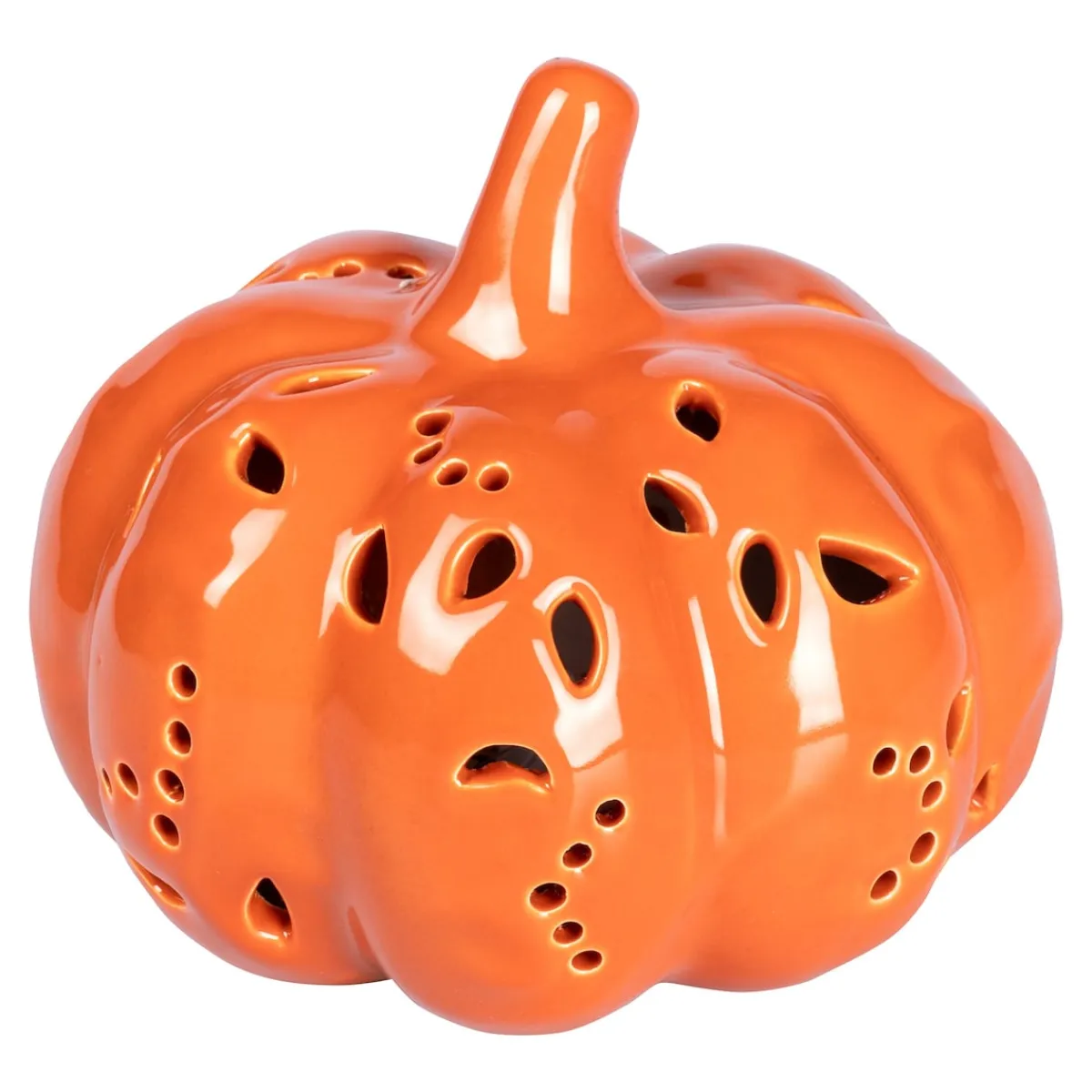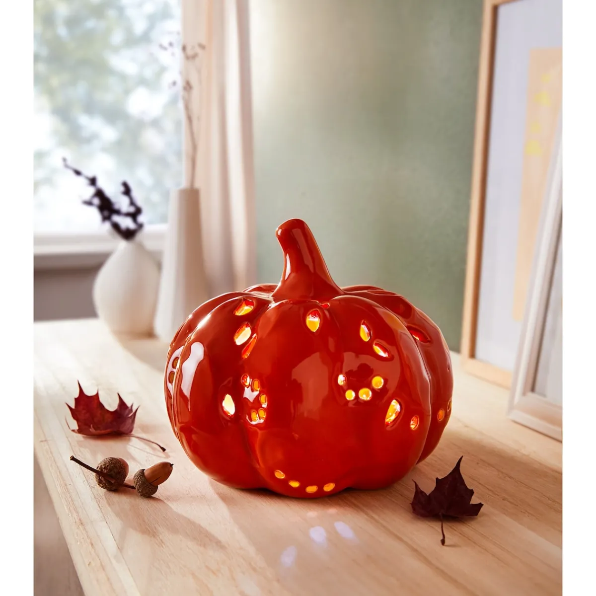 Sparen Sie sich das Aushöhlen und Schnitzen eines Halloween-Kürbis: Mit diesem glänzenden Exemplar aus Porzellan schaffen Sie dank LED-Beleuchtung eine stimmungsvolle Atmosphäre, die den Spaß und die Freude dieser schaurig-schönen Jahreszeit lebendig hält.
