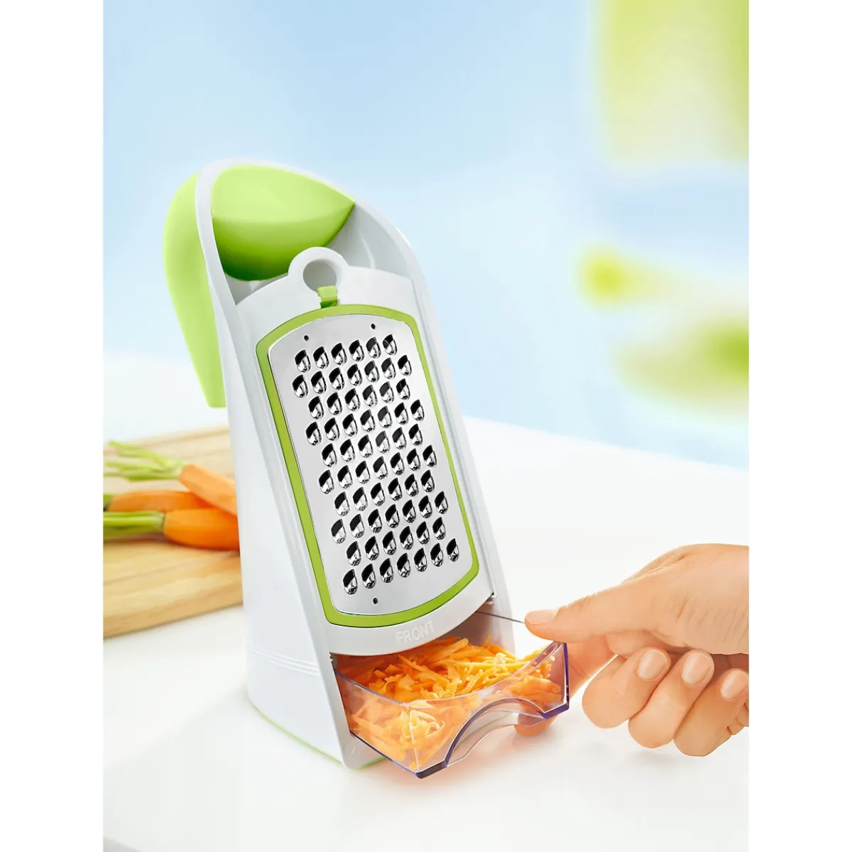 Die Profi-Reibe mit praktischer Auffang-Schublade ist ein wahres Multitalent. Mit 3 unterschiedlichen, auswechselbaren Reibe-Einsätzen für fein Geriebenes, Geraspeltes oder Scheiben – alles landet direkt in der Auffang-Schublade und lässt sich einfach entnehmen. Durch den geformten Griff liegt sie optimal in der Hand und lässt sich sicher halten. Mit rutschfester Unterseite für sicheres Arbeiten.