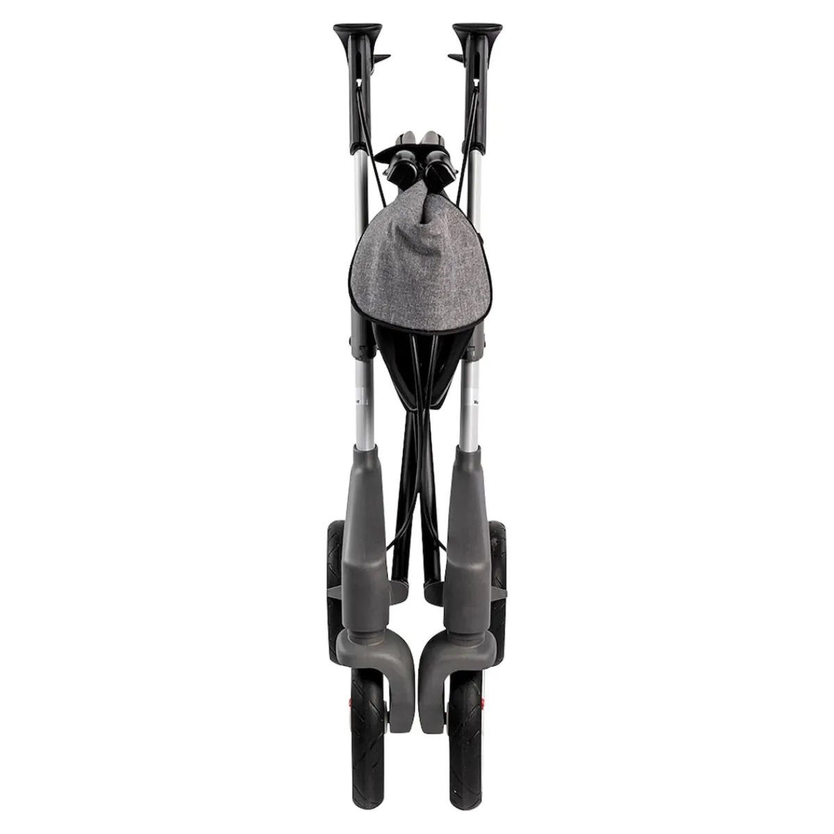Die Höhenverstellung der Handgriffe erfolgt intuitiv und ermöglicht eine individuelle Anpassung an die Bedürfnisse des Benutzers. Der flexible Handgriff (ErgoGrip) bietet nicht nur einen bequemen Griff beim Gehen, sondern dient auch als Armlehne im Sitzen. Die stoßabsorbierenden Reifen sorgen für eine sanfte Federung und einen außergewöhnlichen Fahrkomfort.