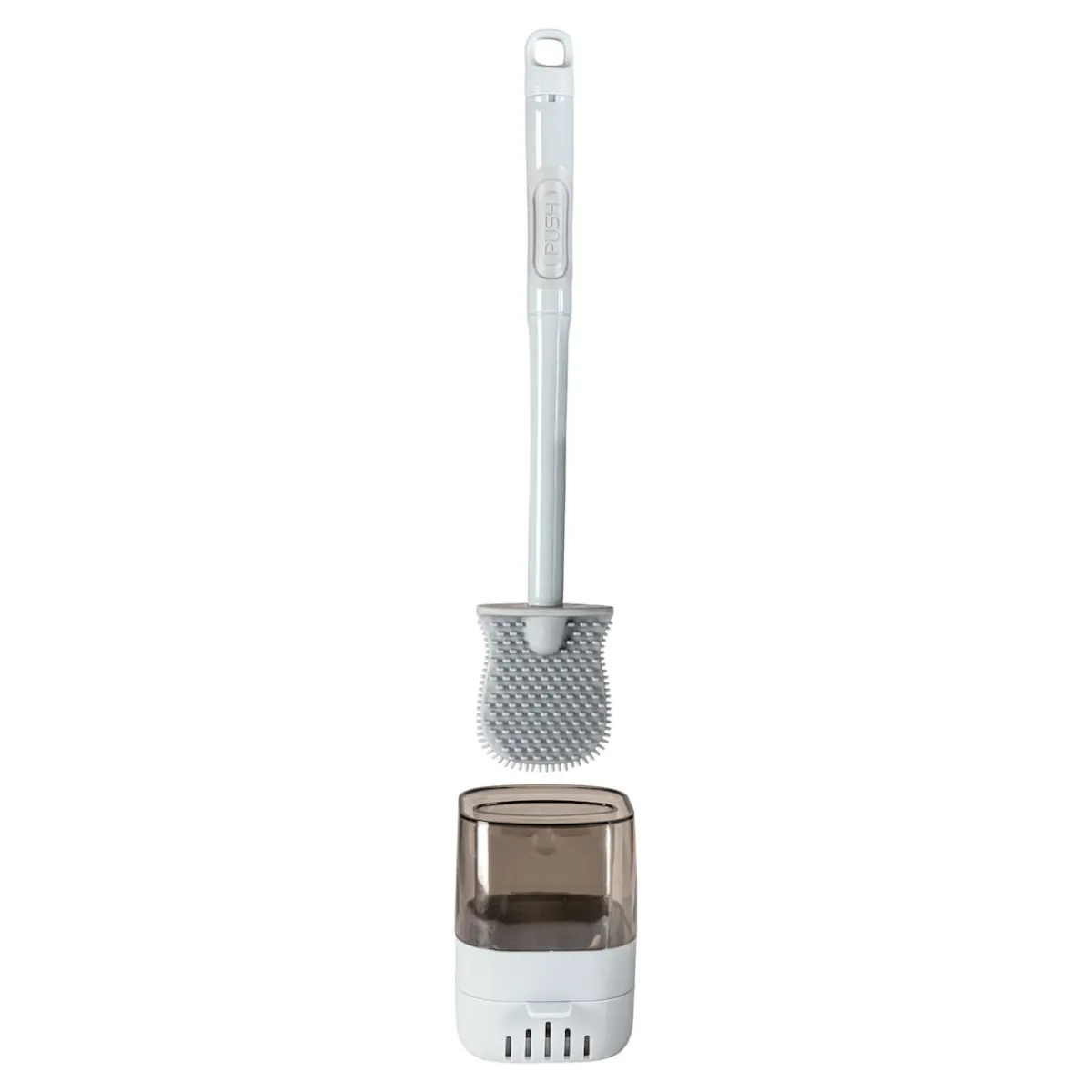 Stets frische Sauberkeit! Auf Knopfdruck versprüht diese WC-Bürste beim Putzen das eingefüllte Reinigungsmittel (Fassungsvermögen: 40 ml) und erspart Ihnen so einen Arbeitsgang! Der Bürstenkopf aus hygienischem Silikon erreicht auch schwer erreichbare Stellen unter dem Rand und ist leicht zu reinigen. Im mitgelieferten Behälter wartet sie hygienisch und geruchssicher auf ihren nächsten Einsatz. Inkl. Klebepad zur Wandbefestigung.