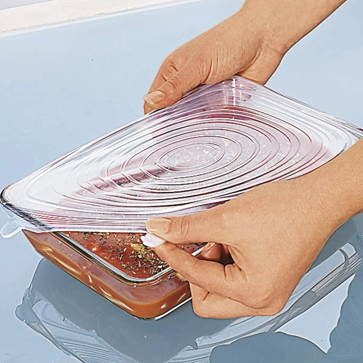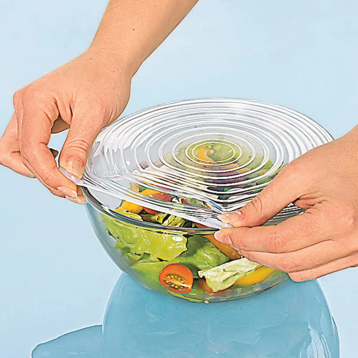 Mit den dehnbaren Silikondeckeln lassen sich Schüsseln, Gläser, Tassen oder Dosen luftdicht verschließen. Sie können für verschiedene Materialien wie Glas, Keramik oder Metall verwendet werden. Die Frischhaltedeckel schützen das Aroma von Lebensmitteln und verhindern gleichzeitig eine Geruchsbildung, Schimmel und Gefrierbrand. Dabei nehmen sie selbst keine Gerüche auf. Im Backofen oder der Mikrowelle vermeiden die Abdeckhauben Spritzer beim Erhitzen von Speisen. Im Kühl- oder Gefrierschrank sorgen sie dafür, dass Lebensmittel länger frisch bleiben und schließen Gerüche ein. Das stabile Material ist so robust, dass sich die Behälter platzsparend Stapeln lassen. Die dehnbaren Silikondeckel überzeugen durch ihre Langlebigkeit, Stabilität und Flexibilität.