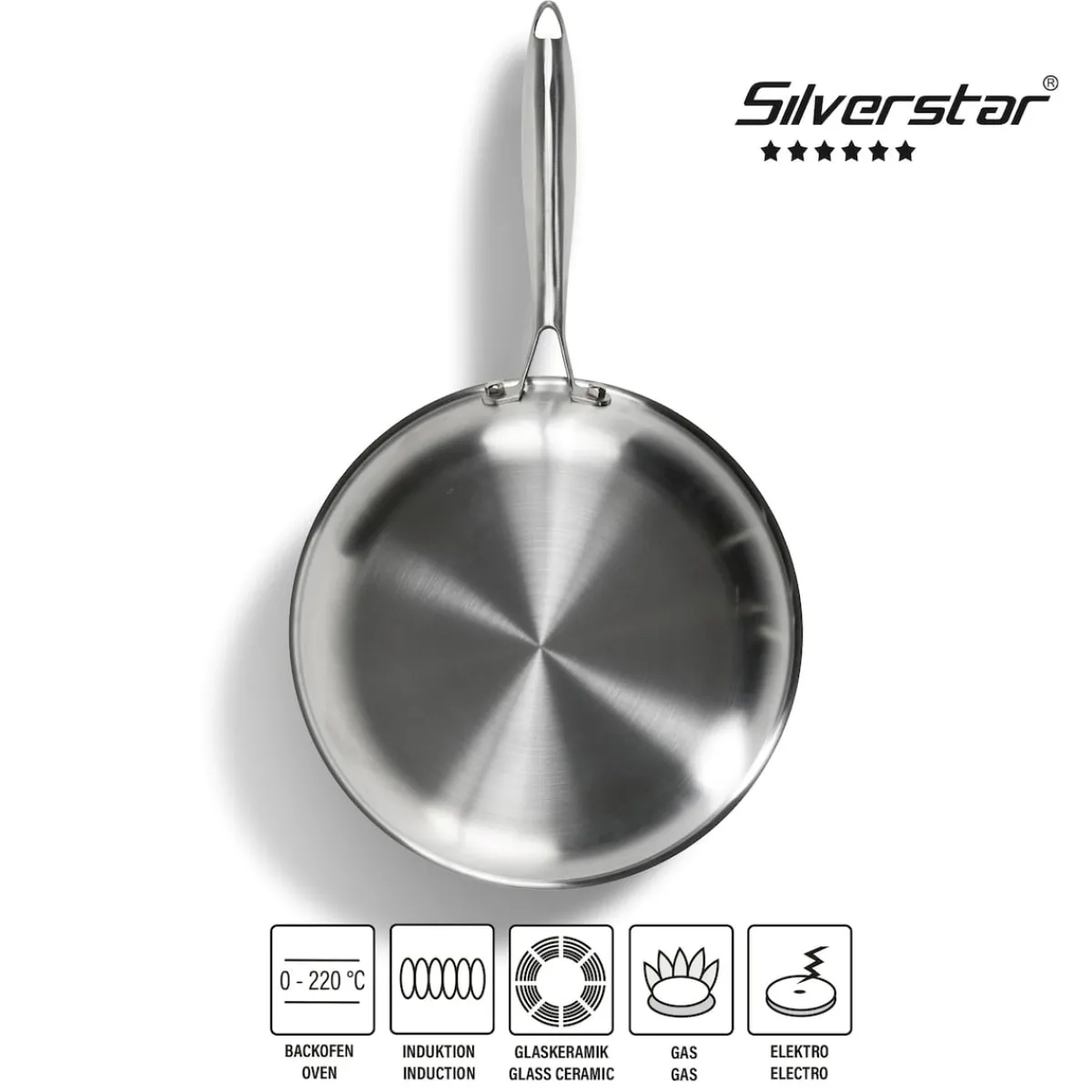 Silverstar Unzerstörbar! Patentiert! Professionell! Wenn es um die Pfanne für das perfekte Steak geht, ist das die erste Wahl: Die Profi Edelstahl Pfannen von Silverstar! Die patentierten Pfannen vereinen die besten Eigenschaften einer Edelstahlpfanne mit denen einer Antihaftpfanne. Wie das funktioniert? Der Pfannenkörper besteht aus dem Dreischicht-Material „Edelstahl – Aluminiumkern – Edelstahl“. Diese Materialkombination gewährleistet eine schnelle Erhitzung des Kochgeschirrs sowie eine perfekte und gleichmäßige Wärmeverteilung vom Pfannenboden bis zum Rand. Im letzten Produktionsschritt wird die Pfanne antihaftversiegelt. Es handelt sich dabei um eine 100 % unzerstörbare Innenboden-Beschichtung, die selbst Küchenhelfern aus Metall standhält. Grund dafür ist die spezielle Silverstar Antihaftbeschichtung mit erhöht gelegener Sterne-Struktur aus Edelstahl. Die filigrane Struktur bewirkt, dass Sie Ihr Steak oder Grillgemüse scharf und bei hohen Temperaturen wie in einer klassischen Edelstahlpfanne anbraten können. Gleichzeitig lässt die Antihaftversiegelung die Speisen leicht aus dem Kochgeschirr lösen. Ein punktgenaues und gleichmäßiges Bratergebnis ist damit garantiert. Durch die Sterne-Struktur ist die Pfanne außerdem unempfindlich gegen Kratzer und Abrieb. Die Pfannen sind bis zum Schüttrand antihaftbeschichtet, was ein einfaches Herausgleiten der Speisen auf den Teller garantiert. Die antihaftversiegelten Silverstar Edelstahlpfannen sind für alle Herdarten geeignet und können selbstverständlich auch auf Herden mit Induktion verwendet werden. Im Backofen hält das Material Temperaturen bis 220 °C stand. Also ab mit der Pfanne und dem gebratenen Gemüse in den Backofen zum Gratinieren. Hmmm … Und die Reinigung? Ist genauso unkompliziert wie die Handhabung, denn hier kommen die Vorzüge der Antihaftpfanne erneut zum Vorschein: die Pfanne einfach mit heißem Wasser, einem milden Spülmittel und einem weichen Schwamm auswischen. Das war’s! Mit dem im Lieferumfang enthaltenen Mikrofasertuch können Sie Ihre Pfanne wieder auf Hochglanz bringen. Dieses Set besteht aus: 1 Bratpfanne, ø ca. 20 cm, Höhe: ca. 4 cm, ca. 1 l 1 Bratpfanne, ø ca. 24 cm, Höhe: ca. 4,5 cm, ca. 1,6 l 1 Bratpfanne, ø ca. 28 cm, Höhe: ca. 5,5 cm, ca. 2,5 l 1 Glasdeckel, ø ca. 24 cm 1 Glasdeckel, ø ca. 28 cm 1 Pfannenwender aus Holz 1 Mikrofasertuch Die wichtigsten Vorteile auf einen Blick: Patentierte Edelstahlpfanne mit 100 % unzerstörbarer Innenbeschichtung dank Antihaftversiegelung mit Sterne-Struktur aus Edelstahl Robuster Pfannenkörper aus Dreischicht-Materialkombination Harte, kratzfeste und resistente Innenbeschichtung mit sehr langer Lebensdauer Ideal zum scharfen Anbraten, Kochen, Braten, Gratinieren, Backen Inklusive Mikrofasertuch für ein glänzendes Finish Leichte Reinigung dank Antihaftversiegelung Extra starker, verzugsfreier Boden Bodenstärke: 2,8 mm Für alle Herdarten geeignet, auch Induktion Backofengeeignet bis 220 °C Material: 3-Schicht-Kombination aus „Edelstahl, Aluminiumkern, Edelstahl“ mit Antihaftversiegelung Reinigungs- und Pflegetipps: Vor dem ersten und nach jedem Gebrauch empfehlen wir, Ihr Koch- oder Backgeschirr mit etwas Wasser und einem milden Spülmittel gründlich auszuwaschen. Achten Sie dabei darauf, dass der Artikel ausreichend abgekühlt ist, bevor Sie mit der Reinigung beginnen. Nicht mit kaltem Wasser abschrecken. Dank der Antihaftwirkung wird die Reinigung per Hand empfohlen.