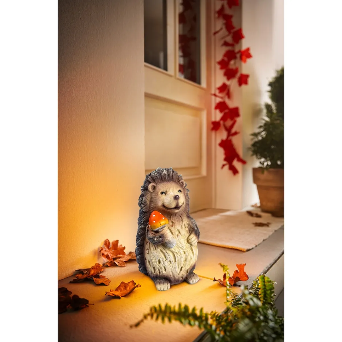Dürfen wir vorstellen: Fridolin sticht tagsüber allein schon wegen seiner imposanten Größe und detailreichen Verarbeitung ins Auge. Dabei strahlt er dank Solar auch noch von innen heraus herzerwärmend, sobald die Dämmerung einsetzt. Als hübschen Hingucker hält er einen leuchtend roten Fliegenpilz im Arm.