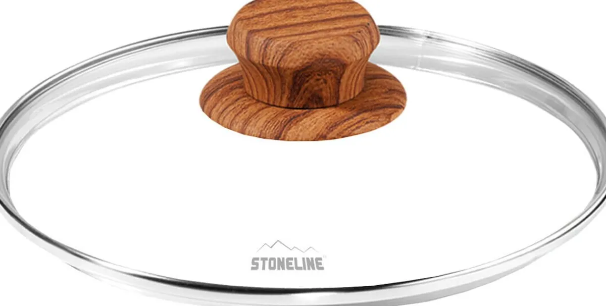 STONELINE – Das Original! Glasdeckel mit Edelstahlrand Passend für Töpfe und Pfannen der Marke STONELINE und andere ø ca. 30 cm Hitzebeständigkeit bis 180° C Mit hochwertigem Deckelknauf aus Kunststoff in Holzoptik