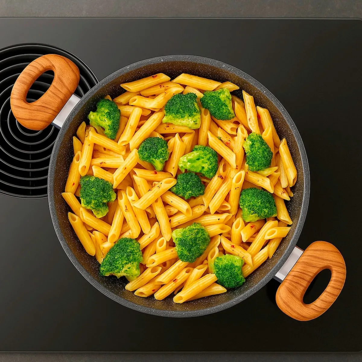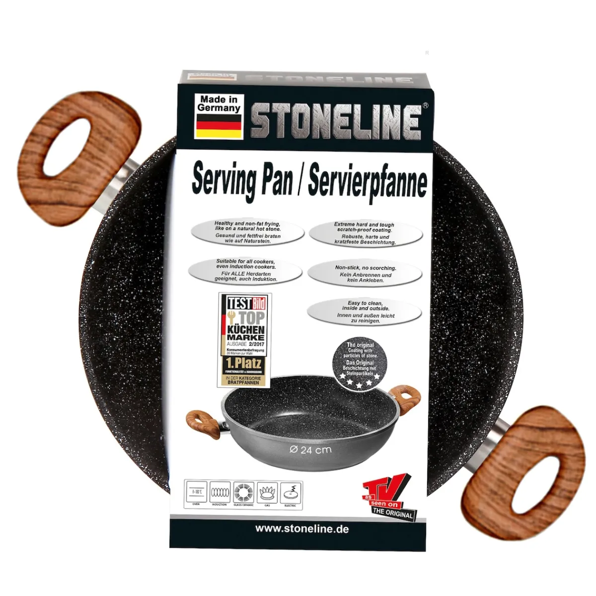 STONELINE – Das Original!Gesund fettfrei kochen und braten!Holz ist das angesagte Style-Element, um jedem Küchen-Ambiente einen warmen Akzent zu verleihen und eine beruhigende, ausgeglichene Atmosphäre zu schaffen. Die Back to Nature-Linie von STONELINE vereint diese Eigenschaften. Die Produkte in stilvoller Holzoptik werden selbst auf der gedeckten Tafel zu einem stimmigen Blickfang. Mit dieser Servierpfanne servieren Sie Ihre Speisen ganz einfach vom Herd direkt auf den Tisch! Die beiden praktischen, kurzen Griffe sorgen dafür, dass Sie die große Pfanne auch dann noch im Griff haben, wenn sie gut gefüllt ist. Diese Servierpfanne ersetzt die herkömmliche Servierschüssel. So kommen Ihre Gerichte immer heiß auf den Tisch und bleiben länger heiß. Dank der speziellen STONELINE-Antihaftbeschichtung lassen sich Ihre Speisen – je nach Wunsch – mit oder ohne Bratfett und Ol zubereiten und ganz ohne Ankleben aus dem Kochgeschirr lösen. Hierbei spielt es keine Rolle, ob Sie auf Glaskeramik, Induktion, Elektro oder Gas kochen. In Kochgeschirr mit der original STONELINE-Beschichtung bleiben keine hartnäckigen Reste haften und die einfache Handwäsche spart Ihnen Zeit und Mühe. 1 Servierpfanne, ø ca. 24 cm, Höhe: ca. 5,9 cm, ca. 2,4 l Die wichtigsten Vorteile des STONELINE Kochgeschirrs auf einen Blick: Kratzfeste STONELINE-Antihaftbeschichtung Vitaminschonend kochen und braten ohne Fett und Ol Optimales Bratergebnis und kross gebratenes Fleisch Auch für Vegetarier geeignet: Gemüse bleibt knackig und saftig Kein Anbrennen und kein Ankleben Super leicht zu reinigen Extra starker, verziehfreier Boden Bodenstärke: 4,5 mm Für alle Herdarten geeignet, auch Induktion Backofengeeignet bis 180 °C Material: Aluminium Reinigungs- und Pflegetipps: Vor dem ersten Gebrauch empfehlen wir, Ihr Koch- oder Backgeschirr mit etwas Wasser und einem milden Spülmittel gründlich auszuwaschen.Verteilen Sie anschließend mit einem Papierküchentuch einige Tropfen Speiseöl auf der Beschichtung.Bei der weiteren Nutzung können Sie auf den Einsatz von Fett oder Ol verzichten!Dank dem Easy-Clean-Effekt wird die Reinigung per Hand empfohlen. Einfach mit heißem Wasser, Handspülmittel und einem weichen Schwamm auswischen.