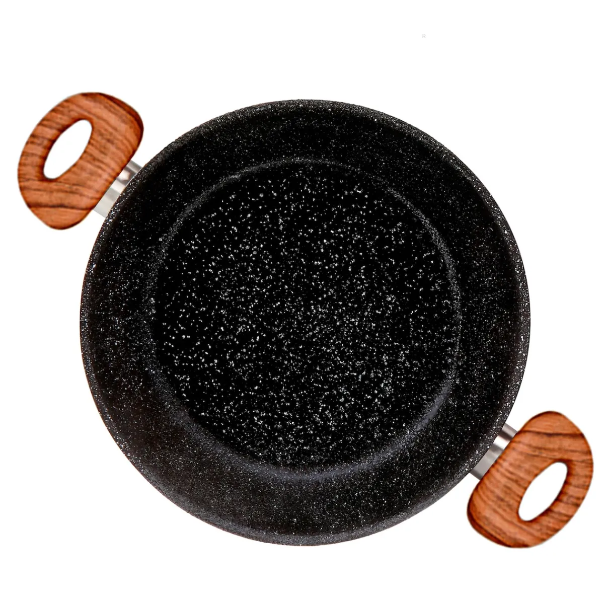 STONELINE – Das Original!Gesund fettfrei kochen und braten!Holz ist das angesagte Style-Element, um jedem Küchen-Ambiente einen warmen Akzent zu verleihen und eine beruhigende, ausgeglichene Atmosphäre zu schaffen. Die Back to Nature-Linie von STONELINE vereint diese Eigenschaften. Die Produkte in stilvoller Holzoptik werden selbst auf der gedeckten Tafel zu einem stimmigen Blickfang. Mit dieser Servierpfanne servieren Sie Ihre Speisen ganz einfach vom Herd direkt auf den Tisch! Die beiden praktischen, kurzen Griffe sorgen dafür, dass Sie die große Pfanne auch dann noch im Griff haben, wenn sie gut gefüllt ist. Diese Servierpfanne ersetzt die herkömmliche Servierschüssel. So kommen Ihre Gerichte immer heiß auf den Tisch und bleiben länger heiß. Dank der speziellen STONELINE-Antihaftbeschichtung lassen sich Ihre Speisen – je nach Wunsch – mit oder ohne Bratfett und Ol zubereiten und ganz ohne Ankleben aus dem Kochgeschirr lösen. Hierbei spielt es keine Rolle, ob Sie auf Glaskeramik, Induktion, Elektro oder Gas kochen. In Kochgeschirr mit der original STONELINE-Beschichtung bleiben keine hartnäckigen Reste haften und die einfache Handwäsche spart Ihnen Zeit und Mühe. 1 Servierpfanne, ø ca. 28 cm, Höhe: ca. 6,4 cm, ca. 3,1 l Die wichtigsten Vorteile des STONELINE Kochgeschirrs auf einen Blick: Kratzfeste STONELINE-Antihaftbeschichtung Vitaminschonend kochen und braten ohne Fett und Ol Optimales Bratergebnis und kross gebratenes Fleisch Auch für Vegetarier geeignet: Gemüse bleibt knackig und saftig Kein Anbrennen und kein Ankleben Super leicht zu reinigen Extra starker, verziehfreier Boden Bodenstärke: 4,5 mm Für alle Herdarten geeignet, auch Induktion Backofengeeignet bis 180 °C Material: Aluminium Reinigungs- und Pflegetipps: Vor dem ersten Gebrauch empfehlen wir, Ihr Koch- oder Backgeschirr mit etwas Wasser und einem milden Spülmittel gründlich auszuwaschen.Verteilen Sie anschließend mit einem Papierküchentuch einige Tropfen Speiseöl auf der Beschichtung.Bei der weiteren Nutzung können Sie auf den Einsatz von Fett oder Ol verzichten!Dank dem Easy-Clean-Effekt wird die Reinigung per Hand empfohlen. Einfach mit heißem Wasser, Handspülmittel und einem weichen Schwamm auswischen.