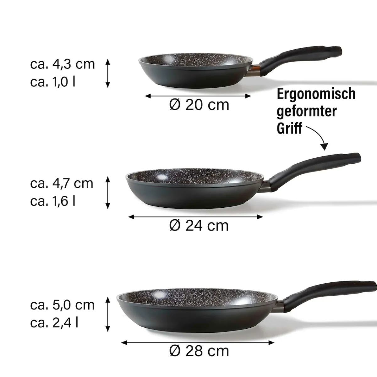 Die geniale STONELINE Beschichtung nun auch in Keramik-Ausführung!Gesundes, vitaminschonendes Kochen mit wenig Fett Dieses Pfannen-Set ist ideal für alle Brat- und Schmorgerichte! Bereiten Sie knusprige Bratkartoffeln, leckeres Gemüse, luftige Eierspeisen und kross gebratenes Fleisch oder Schnitzel zu. Dank der extrem harten, langlebigen STONELINE CERAMIC Beschichtung mit Lotus Abperl-Effekt werden Sie zukünftig noch mehr Freude beim Zubereiten Ihrer Speisen haben! Hierbei spielt es keine Rolle, ob Sie auf Glaskeramik, Induktion, Elektro oder Gas kochen. Dieses 3-teilige Set besteht aus: 1 Bratpfanne, ø ca. 20 cm, Höhe: ca. 4,3 cm, ca. 1,0 l, Induktionsboden: ø ca. 14 cm1 Bratpfanne, ø ca. 24 cm, Höhe: ca. 4,7 cm, ca. 1,65 l, Induktionsboden: ø ca. 17,7 cm1 Bratpfanne, ø ca. 28 cm, Höhe: ca. 5 cm, ca. 2,4 l, Induktionsboden: ø ca. 21,8 cm Die wichtigsten Vorteile des STONELINE CERAMIC Kochgeschirrs auf einen Blick: Kratzfeste STONELINE- Keramikbeschichtung Optimales Bratergebnis und kross gebratenes Fleisch Bester Geschmack Vitaminschonend kochen und braten mit wenig Fett und Öl Kein Anbrennen und kein Ankleben Super leicht zu reinigen Für alle Herdarten geeignet, auch Induktion Extra starker, verzugsfreier Boden Beschichtung hitzebeständig bis 450 °C Zum Flambieren geeignet Bodenstärke: 2,8 mm Backofengeeignet bis 180 °C Material: AluminiumPFAS frei Reinigungs- und Pflegetipps: Vor dem ersten Gebrauch empfehlen wir, Ihr Koch- oder Backgeschirr mit etwas Wasser und einem milden Spülmittel gründlich auszuwaschen.Verteilen Sie anschließend mit einem Papierküchentuch einige Tropfen Speiseöl auf der Beschichtung.Dank dem Easy-Clean-Effekt wird die Reinigung per Hand empfohlen. Einfach mit heißem Wasser, Handspülmittel und einem weichen Schwamm auswischen.