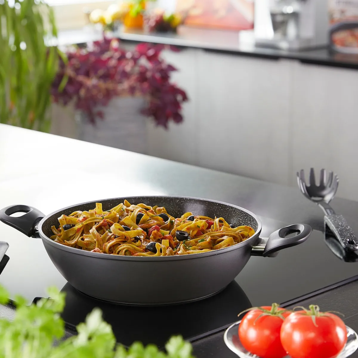 Die geniale STONELINE Beschichtung nun auch in Keramik-Ausführung!Gesundes, vitaminschonendes Kochen mit wenig Fett Mit dieser Servierpfanne servieren Sie Ihre Speisen ganz einfach vom Herd direkt auf den Tisch!Die beiden praktischen, kurzen Griffe sorgen dafür, dass Sie die große Pfanne auch dann noch im Griff haben, wenn sie gut gefüllt ist.Diese Servierpfanne ersetzt die herkömmliche Servierschüssel.So kommen Ihre Gerichte immer heiß auf den Tisch und bleiben länger heiß. Der einzigartige Aroma-Glasdeckel ermöglicht eine dosierte Zugabe von Flüssigkeiten wie z. B. Wein, flüssige Gewürze oder andere Essenzen über den Deckelknauf. So erhalten Ihre verfeinerten Speisen den unverkennbaren Geschmack der zugegebenen Aromen. Dank der extrem harten, langlebigen STONELINE CERAMIC Beschichtung mit Lotus Abperl-Effekt werden Sie zukünftig noch mehr Freude beim Zubereiten Ihrer Speisen haben! Hierbei spielt es keine Rolle, ob Sie auf Glaskeramik, Induktion, Elektro oder Gas kochen. 1 Servierpfanne, ø ca. 24 cm, Höhe: ca. 6,5 cm, ca. 2,4 l1 Aroma-Glasdeckel, ø ca. 24 cm Die wichtigsten Vorteile des STONELINE CERAMIC Kochgeschirrs auf einen Blick: Kratzfeste STONELINE- Keramikbeschichtung Optimales Bratergebnis und kross gebratenes Fleisch Bester Geschmack Vitaminschonend kochen und braten mit wenig Fett und Öl Kein Anbrennen und kein Ankleben Super leicht zu reinigen Für alle Herdarten geeignet, auch Induktion Extra starker, verzugsfreier Boden Beschichtung hitzebeständig bis 450 °C Zum Flambieren geeignet Bodenstärke: 3 mm Backofengeeignet bis 180 °C Material: AluminiumPFAS frei Reinigungs- und Pflegetipps: Vor dem ersten Gebrauch empfehlen wir, Ihr Koch- oder Backgeschirr mit etwas Wasser und einem milden Spülmittel gründlich auszuwaschen.Verteilen Sie anschließend mit einem Papierküchentuch einige Tropfen Speiseöl auf der Beschichtung.Dank dem Easy-Clean-Effekt wird die Reinigung per Hand empfohlen. Einfach mit heißem Wasser, Handspülmittel und einem weichen Schwamm auswischen.