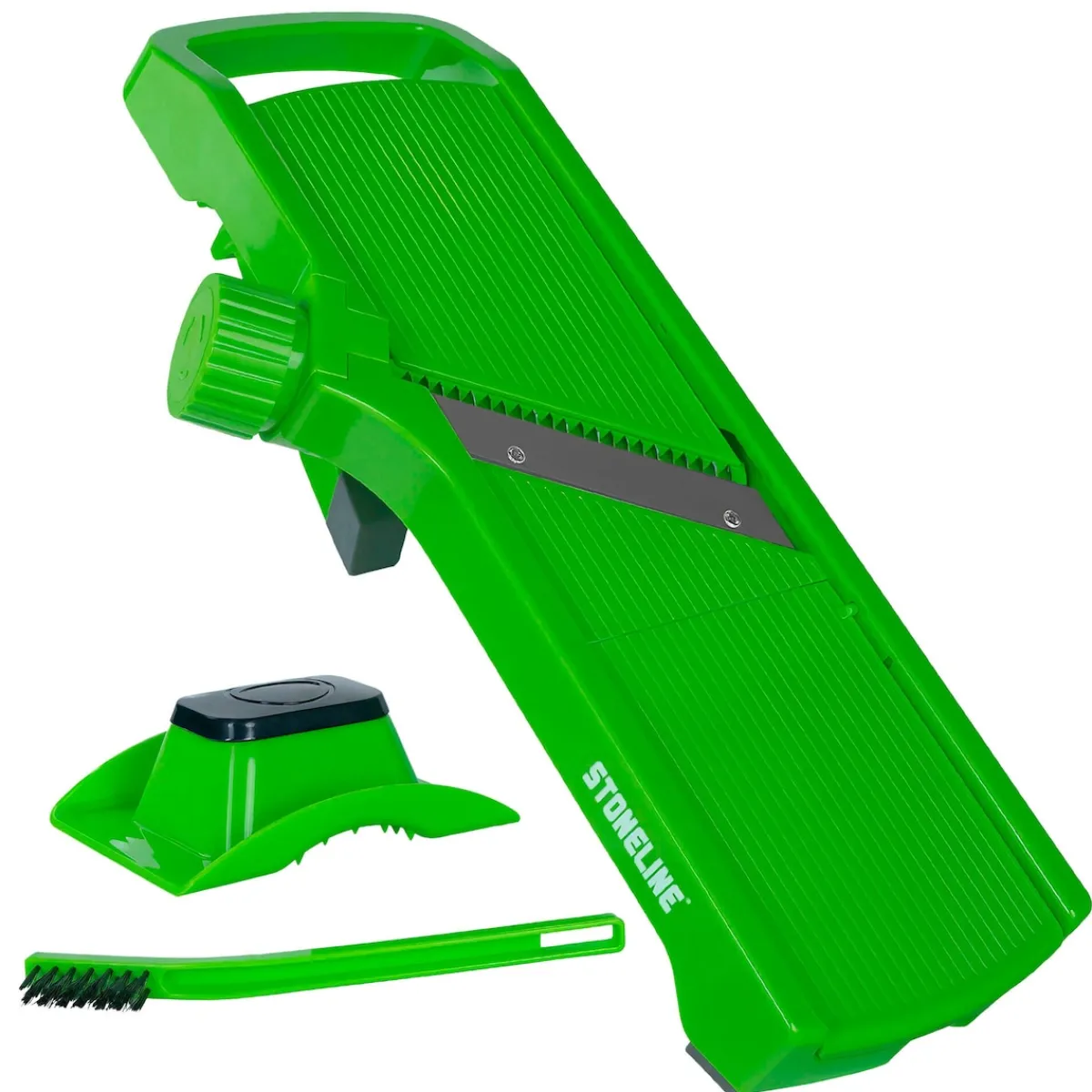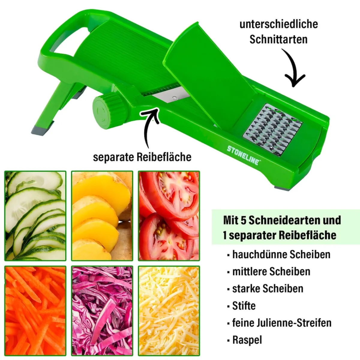 STONELINE – Das Original! Dieser vielseitige STONELINE Gemüseschneider mit sechs verschiedenen Schneidarten sollte in keiner Küche fehlen! Er ist ideal, um Kartoffeln, Kraut, Äpfel, Zwiebeln, Gurken, Möhren, Paprika und vieles mehr ganz leicht und gleichmäßig zu zerteilen. Die Edelstahlklingen mit mikrofeinem Schliff sorgen für ein sauberes und präzises Schneidergebnis. Mithilfe des seitlichen Drehrads kann die gewünschte Schneidart ausgewählt werden: dünne Scheiben mittlere Scheiben Dicke Scheiben Feine Streifen Stifte Zusätzlich besitzt der Gemüsehobel eine Reibe. Auf dieser separaten Fläche kannst du Lebensmittel in dünne Raspel zerkleinern. Der vielseitige Küchenhelfer ist einfach und platzsparend zu verstauen, da der Fuß klappbar und der Hobel damit vielseitig einsetzbar ist: bei ausgeklapptem Fuß zum Hobeln auf einer ebenen Fläche bei eingeklapptem Fuß zum Hobel auf einer Schüssel Für ein sicheres Schneiden ist der V Hobel mit Füßen aus rutschhemmendem Material ausgestattet. Der Fingerschutz-Halter sorgt für einen festen Halt des Schnittguts und ermöglicht das Verarbeiten von Obst und Gemüse bis auf einen minimalen Rest. Mit der mitgelieferten Reinigungsbürste kannst du den Gemüsehobel einfach unter fließendem Wasser abspülen und Speisereste aus dem herausnehmbaren Schneideinsatz und der Reibe entfernen. Dieses Set besteht aus:1 Gemüseschneider mit 5 verschiedenen Klingen und 1 separater Reibfläche 1 Fingerschutz-Halter 1 ReinigungsbürsteIn der Farbe: Grün Die wichtigsten Vorteile auf einen Blick: Vielseitig verwendbarer Hobel mit Drehrad zum Wechseln zwischen 5 verschiedenen Schneidarten Mit separater Reibfläche Ideal zum Zerkleinern von Obst, Gemüse, Käse u. v. m. Mikrofein geschliffene Klingen für einen präzisen und schnellen Schnitt Extra sicher dank Fingerschutz-Halter und rutschfestem Fuß Material Klingen: rostfreier Edelstahl