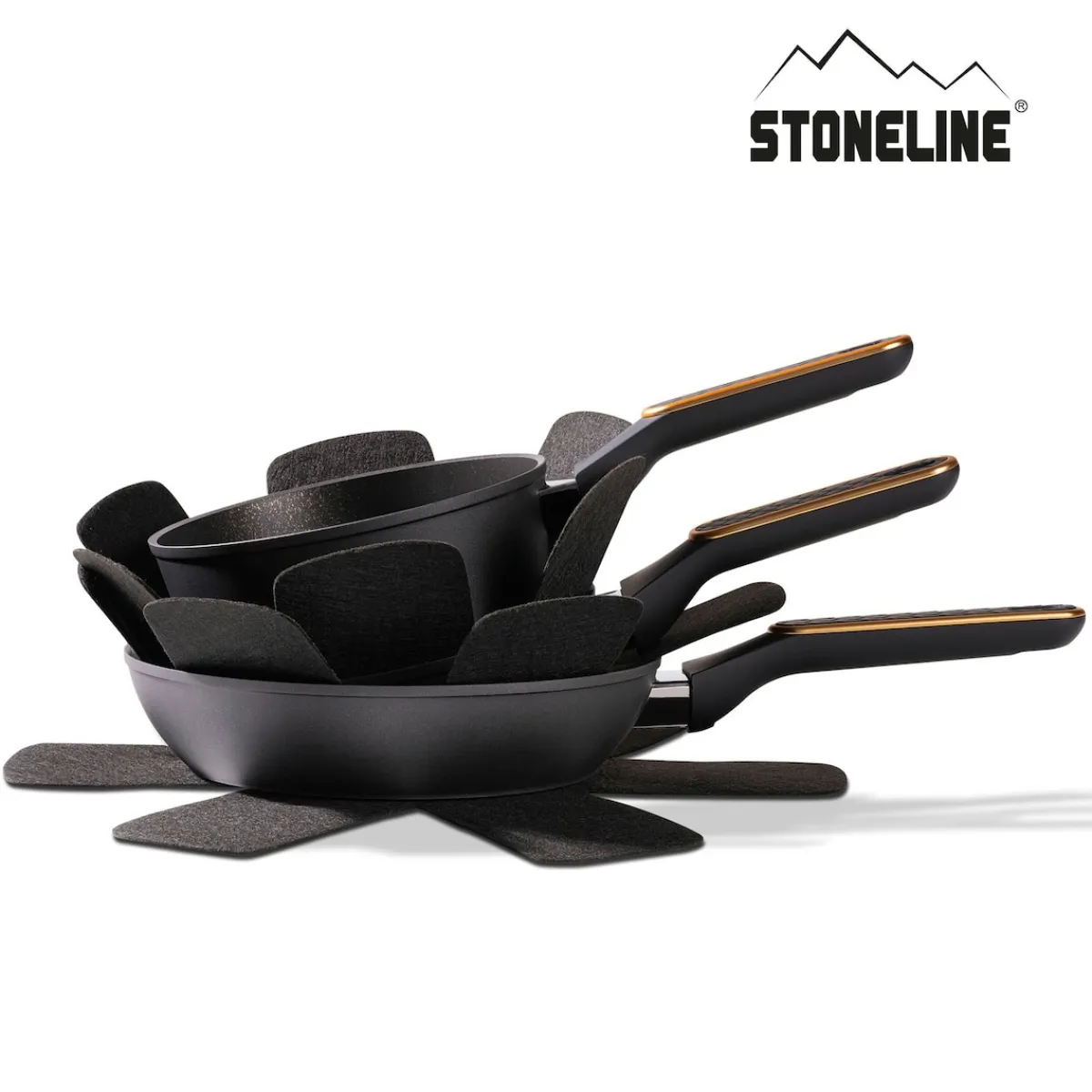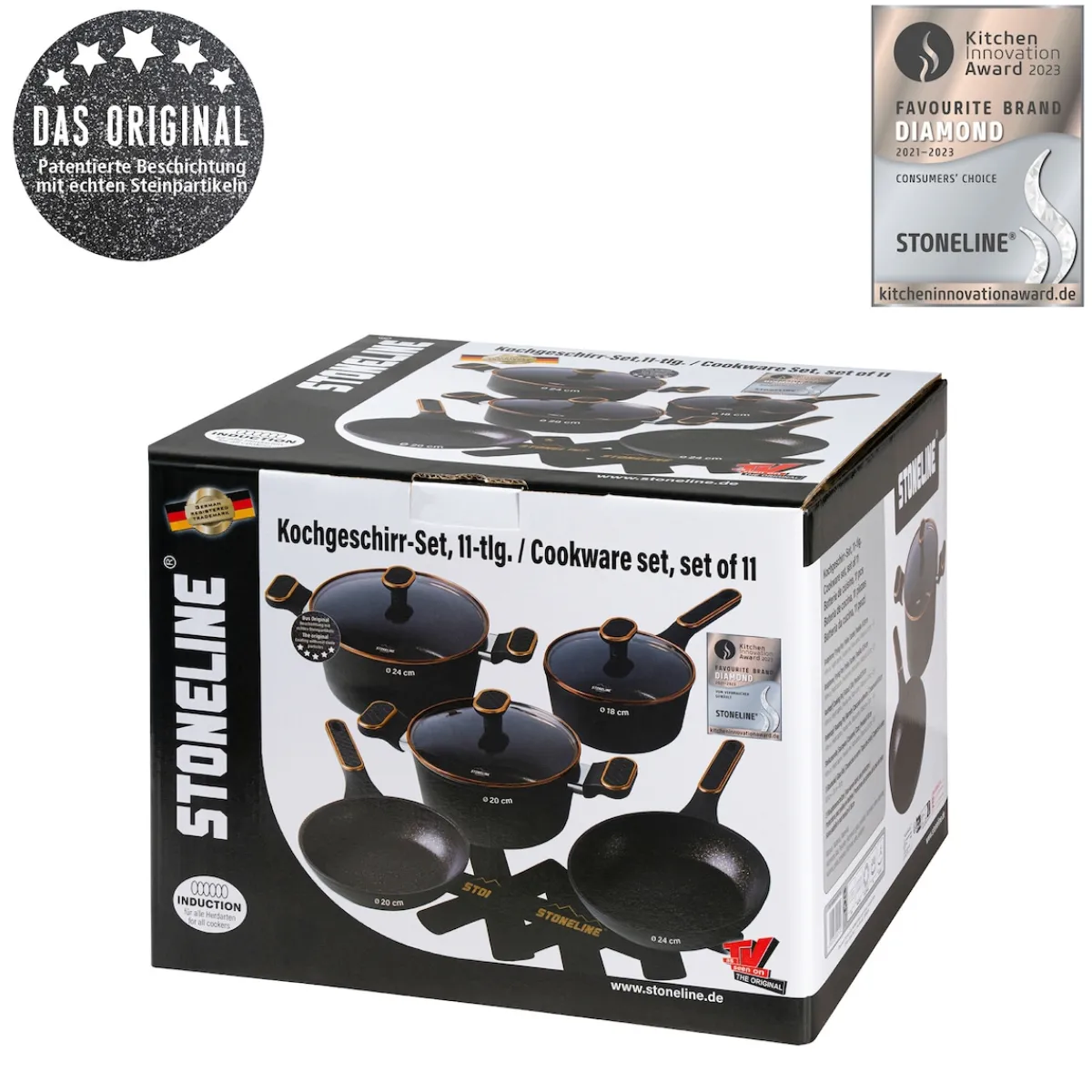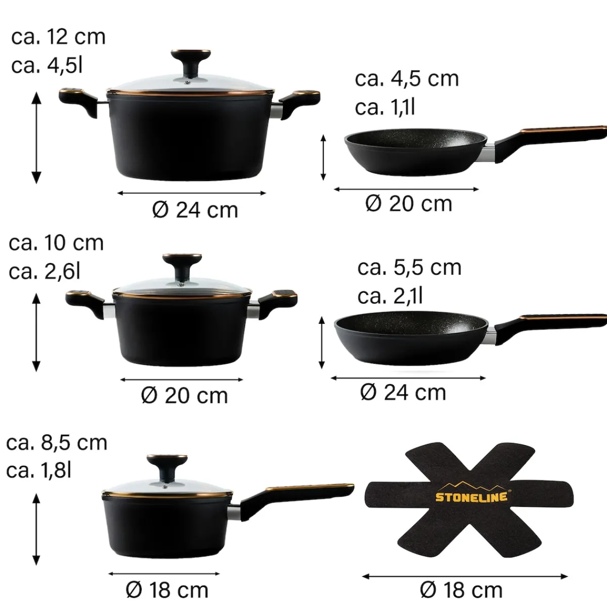 STONELINE – Das Original!Gesund fettfrei kochen und braten!Eleganz und Leidenschaft. Verleihe deiner Küche einen modernen, edlen Touch mit dem STONELINE Kochgeschirr-Set in Mattschwarz. Die eleganten Roségold-Details an den Deckeln und Griffen setzen stilvolle Akzente und bringen einen Hauch von Luxus in deine Küche. Die einzigartige Farbkombination von Mattschwarz und Roségold vereint schlichte Eleganz mit einem modernen, luxuriösen Design. Mit diesem Set machst du nicht nur dein Kochen noch mehr zum Erlebnis, sondern setzt auch ein Statement für modernes Design und stilvolles Kochen. Hol dir das perfekte Zusammenspiel aus Funktion und Ästhetik und lass deine kulinarischen Kreationen noch mehr glänzen!Dieses Set ist der perfekte Küchenhelfer für jeden Anlass. Egal, ob du schnell etwas braten oder ein aufwendigeres Gericht zaubern möchtest – mit den praktischen Töpfen, Pfannen und Deckeln hast du immer das richtige Kochgeschirr zur Hand und die Zubereitung deiner Lieblingsgerichte macht doppelt soviel Spaß.Die Glasdeckel mit Edelstahlrand in Roségold sind eine großartige Ergänzung zu deinem Kochgeschirr. Der Knauf der Deckel bleibt angenehm kühl, damit du dich während des Kochvorgangs nicht verbrennst. So wird das Kochen noch komfortabler und sicherer!Mit diesem Kochgeschirr-Set kannst du dich auf jede Mahlzeit freuen, die du mit Liebe und Kreativität zubereitest. Es bringt nicht nur Stil in deine Küche, sondern sorgt auch dafür, dass du dich beim Kochen voll und ganz auf den Geschmack konzentrieren kannst. Hol dir das Set und genieße das Kochen in vollen Zügen!Dank der speziellen STONELINE Antihaftbeschichtung in Goldoptik kannst du deine Speisen in den Pfannen und Töpfen – je nach Wunsch – mit oder ohne Bratfett und Öl zubereiten und sie ganz ohne Ankleben aus dem Kochgeschirr lösen.Es spielt keine Rolle, ob du auf Glaskeramik, Induktion, Elektro oder Gas kochst. In den Pfannen und Töpfen mit der original STONELINE Antihaftbeschichtung bleiben keine hartnäckigen Reste haften und die einfache Handwäsche spart dir Zeit und Mühe.Dieses Set besteht aus: 1 Bratentopf, ø ca. 24 cm, Höhe: ca. 12 cm, ca. 4,5 l, Induktionsboden: ø ca. 20,1 cm1 Kochtopf, ø ca. 20 cm, Höhe: ca. 10 cm, ca. 2,6 l, Induktionsboden: ø ca. 16,8 cm1 Stielkasserolle, ø ca. 18 cm, Höhe: ca. 8,3 cm, ca. 1,8 l, Induktionsboden: ø ca. 15 cm1 Bratpfanne, ø ca. 24 cm, Höhe: ca. 5,5 cm, ca. 1,9 l, Induktionsboden: ø ca. 18,8 cm1 Bratpfanne, ø ca. 20 cm, Höhe: ca. 4,5 cm, ca. 1,0 l, Induktionsboden: ø ca. 14,8 cm1 Glasdeckel, ø ca. 24 cm1 Glasdeckel, ø ca. 20 cm1 Glasdeckel, ø ca. 18 cm3 VliespfannenschützerIn der Farbe: Schwarz / RoségoldDie wichtigsten Vorteile auf einen Blick:Weltweit einzige Antihaftbeschichtung mit echten SteinpartikelnKratzfeste STONELINE-AntihaftbeschichtungGlasdeckel mit EdelstahlrandVitaminschonend kochen und braten ohne Fett und ÖlOptimales Bratergebnis und kross gebratenes FleischAuch für Vegetarier geeignet: Gemüse bleibt knackig und saftigKein Anbrennen und kein AnklebenSuper leicht zu reinigen dank Easy-Clean EffektExtra starker, verzugsfreier BodenBodenstärke: ca. 3,5 mmFür alle Herdarten geeignet, auch InduktionBackofengeeignet bis 150 °CMaterial: AluminiumReinigungs- und Pflegetipps:Vor dem ersten Gebrauch empfehlen wir, dein Koch- oder Backgeschirr mit etwas Wasser und einem milden Spülmittel gründlich auszuwaschen. Verteile anschließend mit einem Papierküchentuch einige Tropfen Speiseöl auf der Beschichtung.Bei der weiteren Nutzung kannst du auf den Einsatz von Fett oder Öl verzichten!Dank dem Easy-Clean-Effekt wird die Reinigung per Hand empfohlen. Einfach mit heißem Wasser, Handspülmittel und einem weichen Schwamm auswischen.