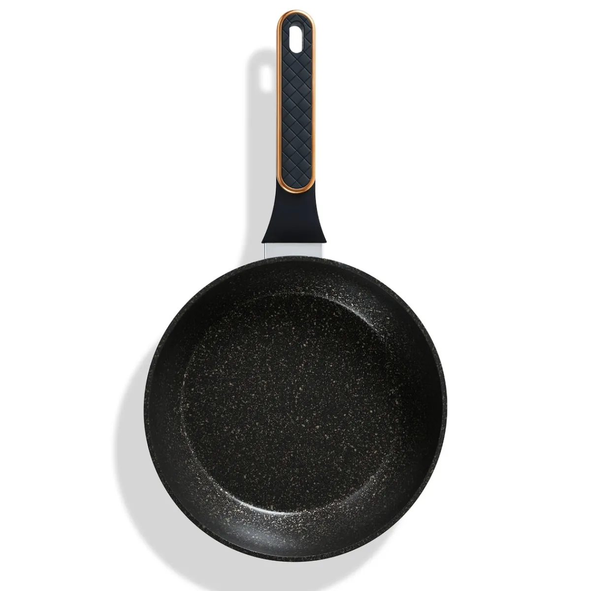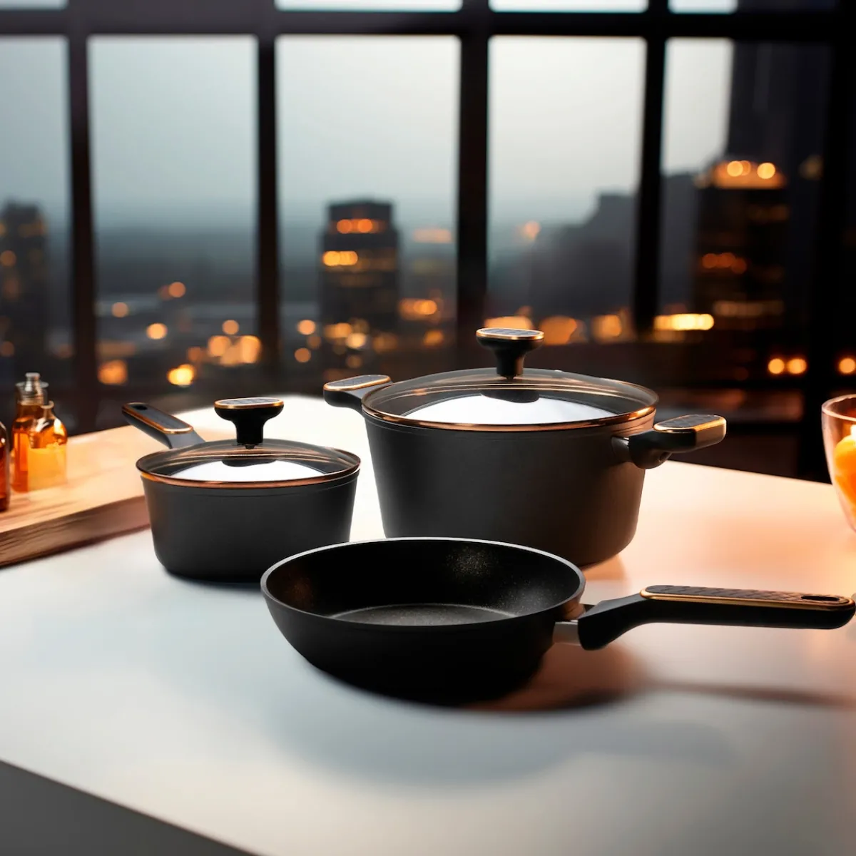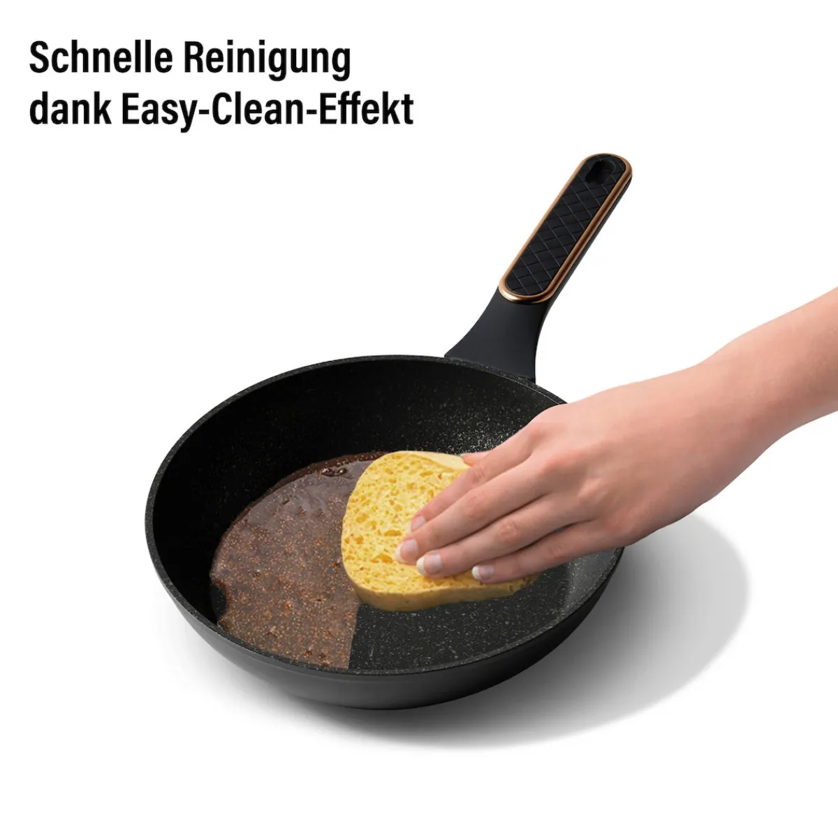 STONELINE – Das Original!Gesund fettfrei kochen und braten!Eleganz und Leidenschaft. Verleihe deiner Küche einen modernen, edlen Touch mit dem STONELINE Kochgeschirr-Set in Mattschwarz. Die eleganten Roségold-Details an den Deckeln und Griffen setzen stilvolle Akzente und bringen einen Hauch von Luxus in deine Küche. Die einzigartige Farbkombination von Mattschwarz und Roségold vereint schlichte Eleganz mit einem modernen, luxuriösen Design. Mit diesem Set machst du nicht nur dein Kochen noch mehr zum Erlebnis, sondern setzt auch ein Statement für modernes Design und stilvolles Kochen. Hol dir das perfekte Zusammenspiel aus Funktion und Ästhetik und lass deine kulinarischen Kreationen noch mehr glänzen!Dieses Set ist der perfekte Küchenhelfer für jeden Anlass. Egal, ob du schnell etwas braten oder ein aufwendigeres Gericht zaubern möchtest – mit den praktischen Töpfen, Pfannen und Deckeln hast du immer das richtige Kochgeschirr zur Hand und die Zubereitung deiner Lieblingsgerichte macht doppelt soviel Spaß.Die Glasdeckel mit Edelstahlrand in Roségold sind eine großartige Ergänzung zu deinem Kochgeschirr. Der Knauf der Deckel bleibt angenehm kühl, damit du dich während des Kochvorgangs nicht verbrennst. So wird das Kochen noch komfortabler und sicherer!Mit diesem Kochgeschirr-Set kannst du dich auf jede Mahlzeit freuen, die du mit Liebe und Kreativität zubereitest. Es bringt nicht nur Stil in deine Küche, sondern sorgt auch dafür, dass du dich beim Kochen voll und ganz auf den Geschmack konzentrieren kannst. Hol dir das Set und genieße das Kochen in vollen Zügen!Dank der speziellen STONELINE Antihaftbeschichtung in Goldoptik kannst du deine Speisen in den Pfannen und Töpfen – je nach Wunsch – mit oder ohne Bratfett und Öl zubereiten und sie ganz ohne Ankleben aus dem Kochgeschirr lösen.Es spielt keine Rolle, ob du auf Glaskeramik, Induktion, Elektro oder Gas kochst. In den Pfannen und Töpfen mit der original STONELINE Antihaftbeschichtung bleiben keine hartnäckigen Reste haften und die einfache Handwäsche spart dir Zeit und Mühe.Dieses Set besteht aus: 1 Bratentopf, ø ca. 24 cm, Höhe: ca. 12 cm, ca. 4,5 l, Induktionsboden: ø ca. 20,1 cm1 Kochtopf, ø ca. 20 cm, Höhe: ca. 10 cm, ca. 2,6 l, Induktionsboden: ø ca. 16,8 cm1 Stielkasserolle, ø ca. 18 cm, Höhe: ca. 8,3 cm, ca. 1,8 l, Induktionsboden: ø ca. 15 cm1 Bratpfanne, ø ca. 24 cm, Höhe: ca. 5,5 cm, ca. 1,9 l, Induktionsboden: ø ca. 18,8 cm1 Bratpfanne, ø ca. 20 cm, Höhe: ca. 4,5 cm, ca. 1,0 l, Induktionsboden: ø ca. 14,8 cm1 Glasdeckel, ø ca. 24 cm1 Glasdeckel, ø ca. 20 cm1 Glasdeckel, ø ca. 18 cm3 VliespfannenschützerIn der Farbe: Schwarz / RoségoldDie wichtigsten Vorteile auf einen Blick:Weltweit einzige Antihaftbeschichtung mit echten SteinpartikelnKratzfeste STONELINE-AntihaftbeschichtungGlasdeckel mit EdelstahlrandVitaminschonend kochen und braten ohne Fett und ÖlOptimales Bratergebnis und kross gebratenes FleischAuch für Vegetarier geeignet: Gemüse bleibt knackig und saftigKein Anbrennen und kein AnklebenSuper leicht zu reinigen dank Easy-Clean EffektExtra starker, verzugsfreier BodenBodenstärke: ca. 3,5 mmFür alle Herdarten geeignet, auch InduktionBackofengeeignet bis 150 °CMaterial: AluminiumReinigungs- und Pflegetipps:Vor dem ersten Gebrauch empfehlen wir, dein Koch- oder Backgeschirr mit etwas Wasser und einem milden Spülmittel gründlich auszuwaschen. Verteile anschließend mit einem Papierküchentuch einige Tropfen Speiseöl auf der Beschichtung.Bei der weiteren Nutzung kannst du auf den Einsatz von Fett oder Öl verzichten!Dank dem Easy-Clean-Effekt wird die Reinigung per Hand empfohlen. Einfach mit heißem Wasser, Handspülmittel und einem weichen Schwamm auswischen.