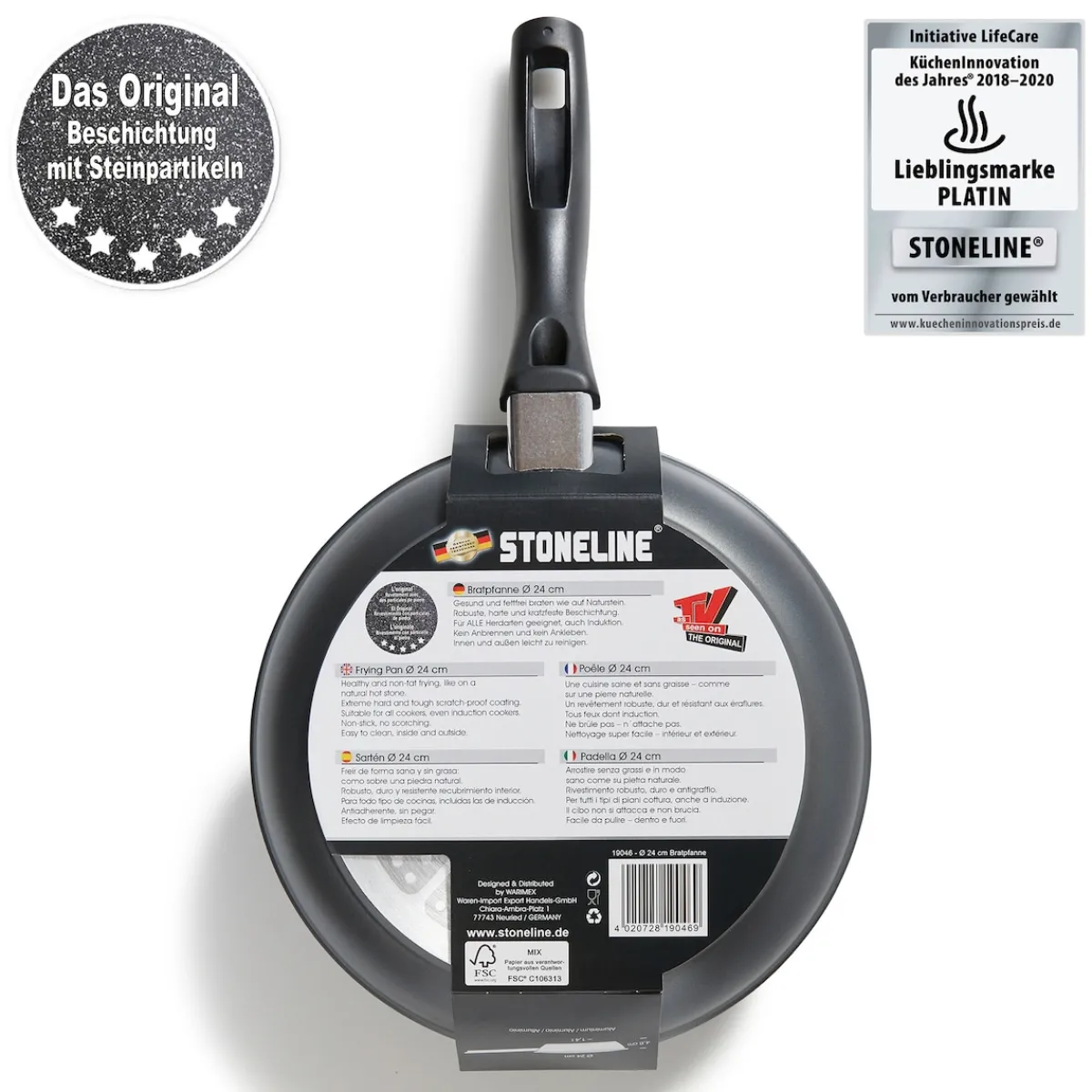 STONELINE Made in Germany!Gesund fettfrei kochen und braten! Mit einem Durchmesser von 24 cm besitzt diese Bratpfanne die Standardgröße und ist in keiner Küche wegzudenken.Braten Sie Fleisch, Gemüse oder Fisch an, ohne dass Ihre Speisen am Pfannenboden haften bleiben. Nach dem Kochen lässt sich die Pfanne spielendleicht reinigen. 1 Bratpfanne, ø ca. 24 cm, Höhe: ca. 4,6 cm, ca. 1,4 l Die wichtigsten Vorteile des STONELINE Kochgeschirrs auf einen Blick: Weltweit einzige Antihaftbeschichtung mit echten Steinpartikeln Kratzfeste STONELINE-Antihaftbeschichtung Optimales Bratergebnis und kross gebratenes Fleisch Bester Geschmack Vitaminschonend kochen und braten ohne Fett und Ol Kein Anbrennen und kein Ankleben Super leicht zu reinigen Für alle Herdarten geeignet, auch Induktion Extra starker, verziehfreier Boden Bodenstärke 4,5 mm Dieses Produkt ist backofengeeignet bis 180 °C Material: Aluminium geschmiedet Reinigungs- und Pflegetipps Vor dem ersten Gebrauch empfehlen wir, Ihr Kochgeschirr mit etwas Wasser und einem milden Spülmittel gründlich auszuwaschen.Verteilen Sie anschließend mit einem Papierküchentuch einige Tropfen Speiseöl auf der Beschichtung.Bei der weiteren Nutzung können Sie auf den Einsatz von Fett oder Ol verzichten!Dank dem Easy-Clean-Effekt wird die Reinigung per Hand empfohlen. Einfach mit heißem Wasser, Handspülmittel und einem weichen Schwamm auswischen.
