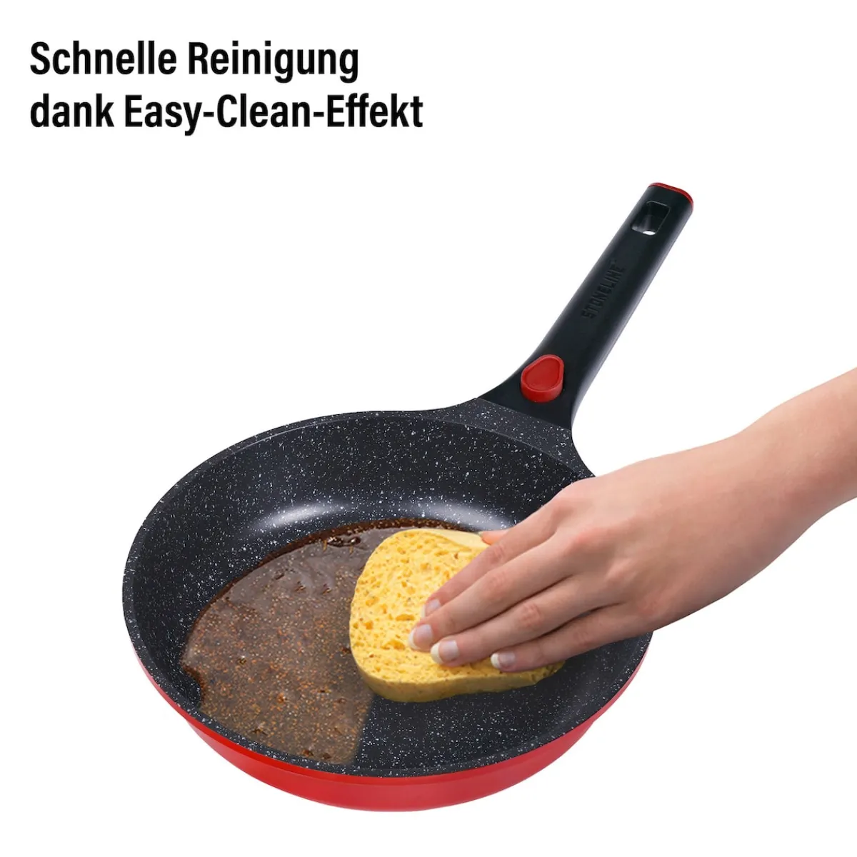 STONELINE – Das Original! Gesund fettfrei kochen und braten! STONELINE Smart – Das intelligente Kochgeschirr für deine Küche Mit der STONELINE Smart Serie wird Kochen, Backen und Servieren so einfach und flexibel wie nie zuvor! Das hochwertige Kochgeschirr aus Aluguss kombiniert durchdachte Funktionen mit modernem Design, langanhaltender Qualität und maximalem Komfort. Der abnehmbare Griff macht das Kochgeschirr besonders vielseitig: Spare Platz bei der Zubereitung auf dem Herd, beim Servieren auf dem Esstisch und bei der Aufbewahrung im Kühlschrank. Außerdem wird dein Kochgeschirr mit abgenommenen Griffen im Handumdrehen ofenfest. Du kannst die Pfannen beispielsweise als Auflaufformen zum Überbacken von Gerichten verwenden. Das spart Zeit und auch zusätzliches Koch- und Backgeschirr. Die Bratpfannen sind sehr geräumig und bieten ausreichend Platz, um auch größere Portionen problemlos zuzubereiten und zu wenden. So bleibt alles in der Pfanne und du kannst dein Gericht perfekt zubereiten, ohne dass etwas herausfällt. Ob Pfanne, Topf oder ganzes Topfset – die STONELINE Smart Serie überzeugt durch ihr robustes Aluminiumguss-Material und garantiert eine optimale Wärmespeicherung und ein energieeffizientes Kochen. Es ist für alle Herdarten geeignet, auch für Induktion. Dank der patentierten STONELINE Antihaftbeschichtung mit echten Steinpartikeln kannst du gesund fettfrei braten, ohne dass etwas haften bleibt oder anbrennt. Die Reinigung ist kinderleicht und spart dir Zeit – meist genügt es, die Pfanne oder den Topf einfach mit etwas Spülmittel, heißem Wasser und einem feuchten Tuch auszuwischen und das Kochgeschirr ist sofort wieder einsatzbereit. Lieferumfang: 1 Bratpfanne, ø ca. 24 cm, Höhe: ca. 5,5 cm, ca. 2,0 l, Induktionsboden: ø ca. 16 cmIn der Farbe: Rot Die wichtigsten Vorteile auf einen Blick: Weltweit einzige Antihaftbeschichtung mit echten Steinpartikeln Kratzfeste STONELINE-Antihaftbeschichtung Abnehmbare Griffe für flexible Einsatzmöglichkeiten Vitaminschonend kochen und braten ohne Fett und Öl Optimales Bratergebnis und kross gebratenes Fleisch Auch für Vegetarier geeignet: Gemüse bleibt knackig und saftig Kein Anbrennen und kein Ankleben Super leicht zu reinigen dank Easy-Clean Effekt Extra starker, verzugsfreier Boden Bodenstärke: ca. 4,5 mm Für alle Herdarten geeignet, auch Induktion Backofengeeignet bis 240 °C (ohne Griff) / 180 °C (mit Griff) Material: Aluminiumguss aus 90 % recyceltem Material Reinigungs- und Pflegetipps: Vor dem ersten Gebrauch empfehlen wir, dein Koch- oder Backgeschirr mit etwas Wasser und einem milden Spülmittel gründlich auszuwaschen. Verteile anschließend mit einem Papierküchentuch einige Tropfen Speiseöl auf der Beschichtung.Bei der weiteren Nutzung kannst du auf den Einsatz von Fett oder Öl verzichten!Dank dem Easy-Clean-Effekt wird die Reinigung per Hand empfohlen. Einfach mit heißem Wasser, Handspülmittel und einem weichen Schwamm auswischen.
