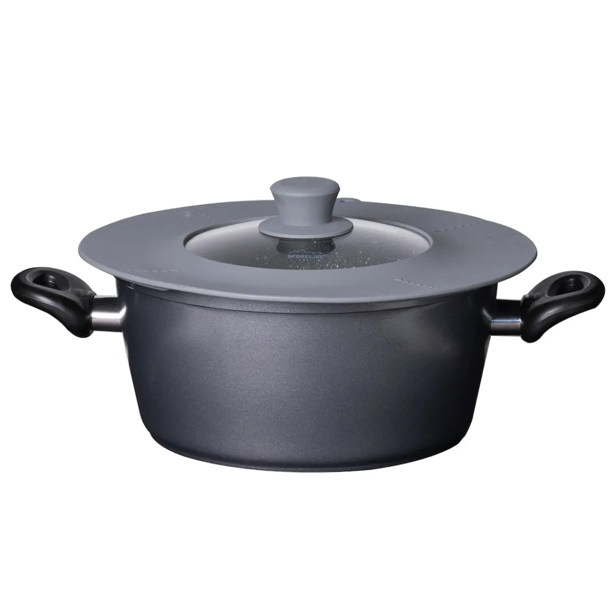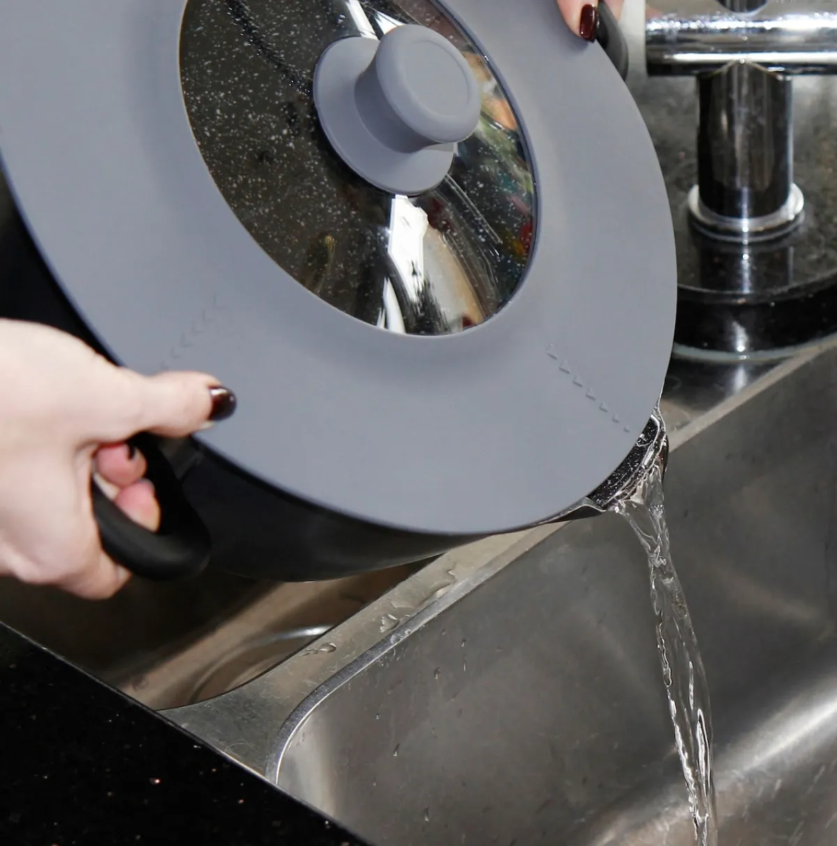 STONELINE – Das Original! Sie kennen wahrscheinlich das Problem, eine komplette Schublade voll mit unzähligen Glasdeckeln zu haben und dennoch finden Sie den passenden Deckel für Ihre Pfanne oder Ihren Topf nicht. Nun ist Schluss mit dem „Deckel-Chaos“ – dank des Universalglasdeckels von STONELINE! Der Universalglasdeckel von STONELINE mit Silikonrand passt auf sieben verschiedene Pfannen- und Topfgrößen! Der Silikonrand schont die Oberfläche des Kochgeschirrs und macht den Glasdeckel bruchsicherer. 1 Glasdeckel mit Silikonrand für die Größen ø 16 / 18 / 20 / 22 / 24 / 26 / 28 cm Sichtfenster aus Glas Keine Verbrennung der Hände dank Silikon-Knauf Mit Dampfauslass Hitzebeständig bis 180 °C Material: Sichtfenster aus bruchstabilisertem Glas, Silikonrand Einfache Reinigung: mit heißem Wasser ausspülen, trocknen, fertig (spülmaschinengeeignet)