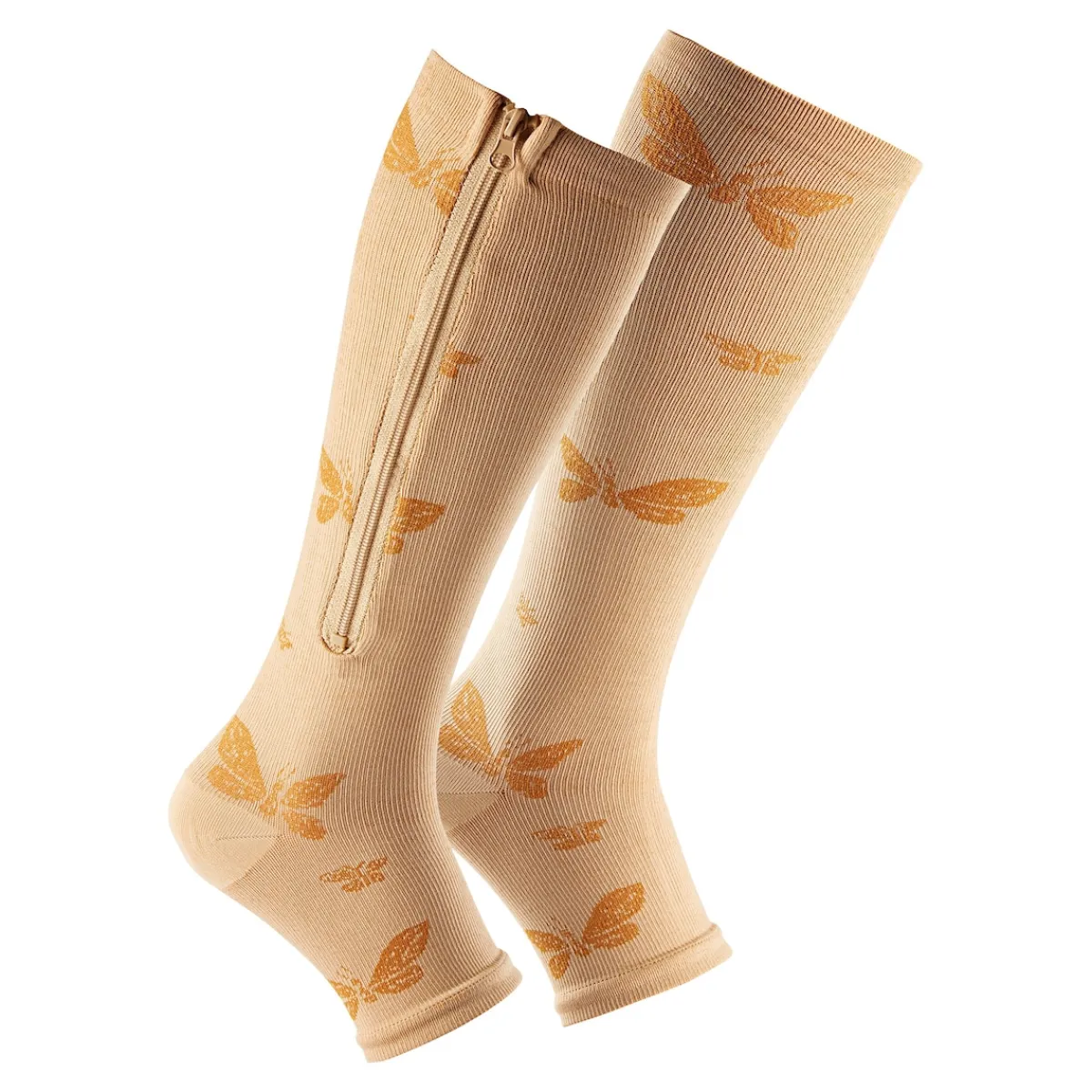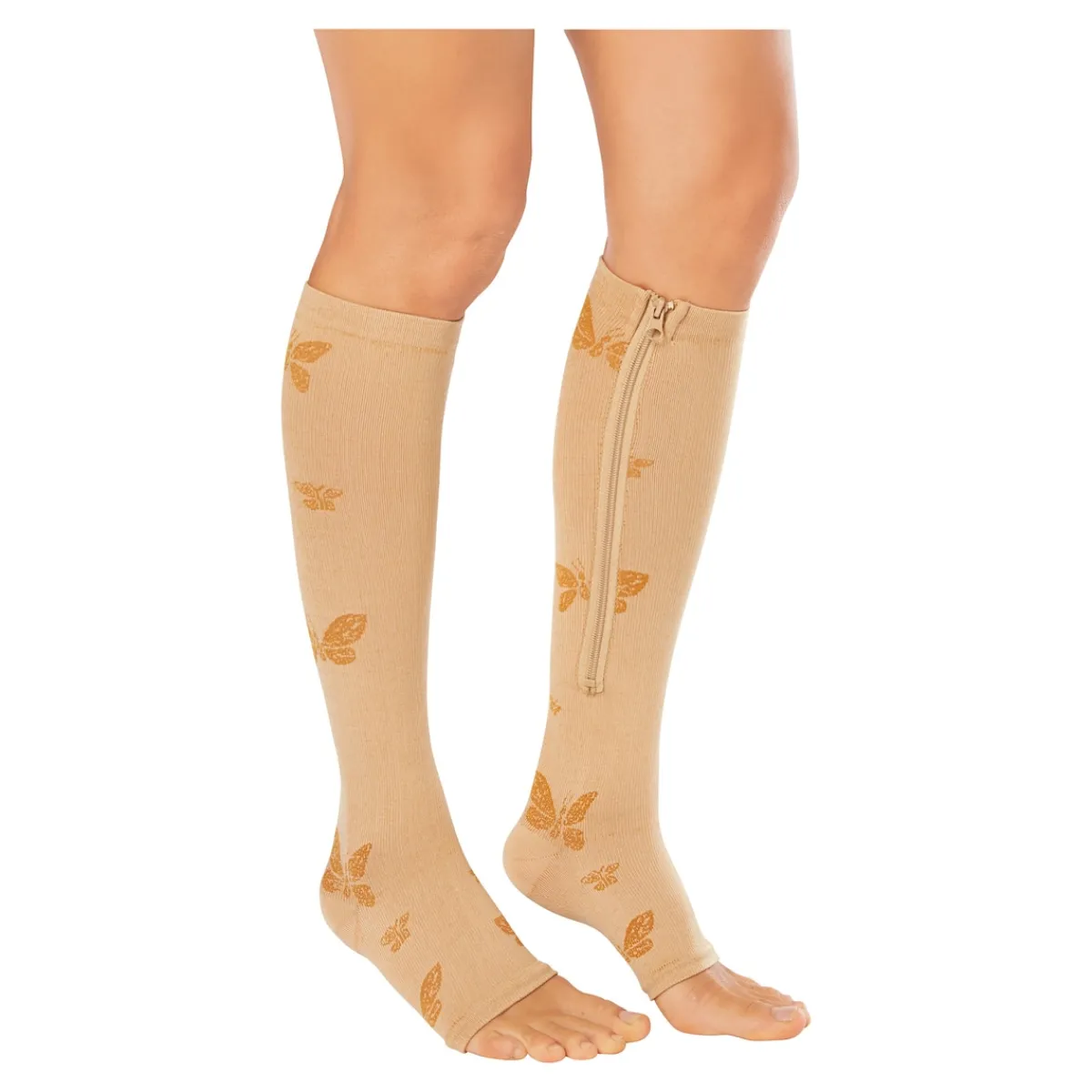 Stützstrümpfe können die Venentätigkeit anregen, Krampfadern und Ödeme entlasten sowie Wasserablagerungen entgegenwirken. Dass solche Helfer nicht nur heilsame Effekte haben können, sondern auch einen modischen Look, beweist dieses attraktive Modell mit Schmetterlings-Motiven. Der Clou: Dank Reißverschluss lassen sich diese Strümpfe auch mit geschwollenen oder empfindlichen Beinen leicht anziehen.