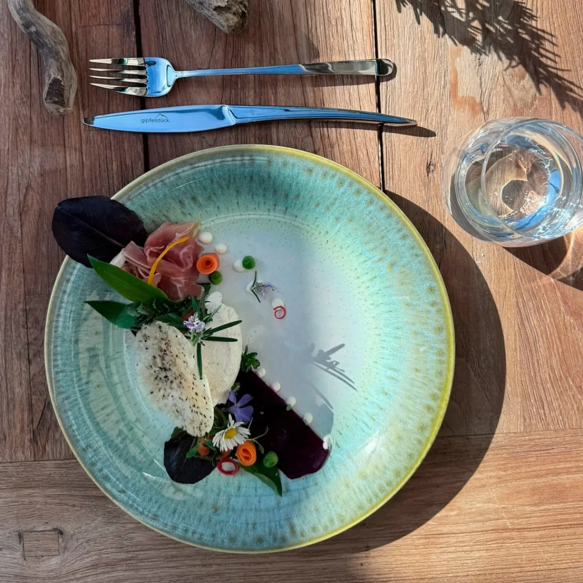 Die Keramik-Geschirr-Serie „Flussufer“ der österreichischen Marke Gipfelstück bringt die Schönheit der Alpen auf Ihren Esstisch. Inspiriert von einem Bergfluss, dessen klares Wasser sich seinen Weg durch grüne Täler und moosbewachsene Steine bahnt, beeindruckt das hochwertige, modern geformte Geschirr-Set durch seinen besonderen Farbverlauf von braun und grün zu blau. Dank der glänzenden, mehrstufig aufgetragenen Reaktivglasur ist jedes Keramikteil ein handgemachtes Einzelstück; aus europäischer Produktion hergestellt in Portugal. Das aus robustem Steinzeug gefertigte, einzigartige Keramikgeschirr ist mikrowellen- und spülmaschinengeeignet und somit auch alltagstauglich und pflegeleicht. Dieses Geschirrset wird klimaneutral in einer auf Bruchsicherheit getesteten Paketversandverpackung aus ressourcenschonenden Materialien versendet. Um eine objektive Vergleichbarkeit zu gewährleisten, gehen unsere Füllmengenangaben von einer randvollen Befüllung aus.