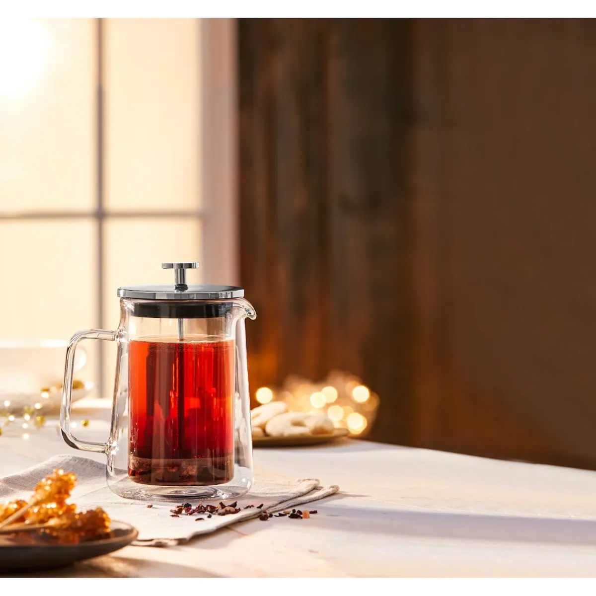 Genießen Sie vollmundigen Tee oder Kaffee auf nachhaltige Weise. Mit der Thermo-Presse geht das ganz einfach: Losen Tee oder Kaffeepulver nach Bedarf einfüllen, mit heißem Wasser aufgießen und ziehen lassen. Anschließend einfach das Sieb nach unten pressen – fertig! Der Clou: Dank des doppelwandigen Designs bleibt das Getränk länger warm, ohne dass Sie sich am Glas die Finger verbrennen – so genießen Sie heiße Köstlichkeiten auch noch lange nach der Zubereitung.