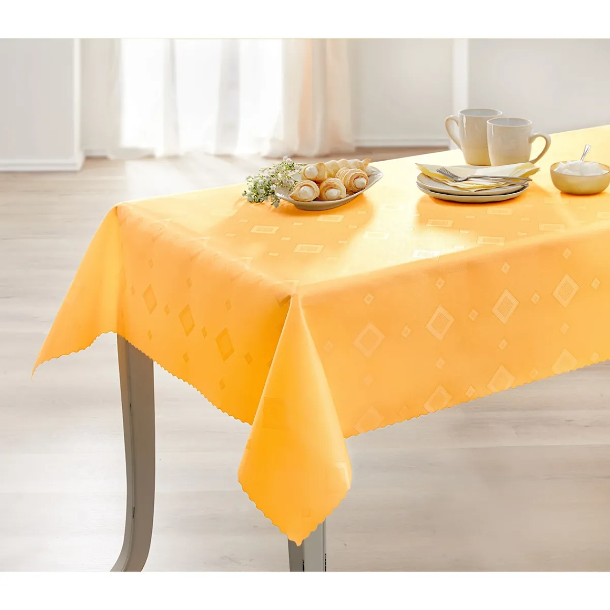 Diese Tischdecke mit attraktivem Rautenmotiv ist aus schwer entflammbarem, wasser- sowie schmutzabweisendem Stoff gefertigt und eignet sich so auch ideal für eine Tischdeko mit Kerzen.