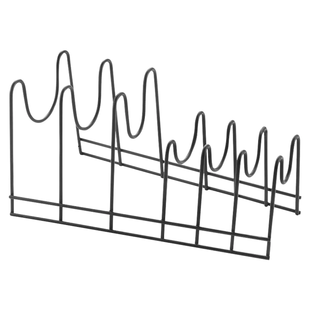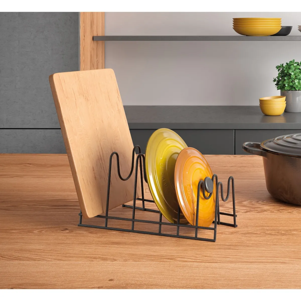 Pfannen und Teller lassen sich im Schrank einfach stapeln, nur bei Töpfen stellt sich oft die Frage: wohin mit den Deckeln? Eine clevere Lösung, um Topfdeckel platzsparend und in Griffweite unterzubringen, bietet der Lido Lava Topfdeckelhalter. Mit dem praktischen Küchenhelfer, den Sie auf der Arbeitsfläche oder im Schrank platzieren können, gelingt es Ihnen ganz einfach, bis zu sechs Topf- oder Pfannendeckel übersichtlich zu organisieren. Bei Bedarf können Sie das üppige Platzangebot des dekorativen Lido Lava Topfdeckelhalters natürlich auch nutzen, um Schneidbretter und andere Küchenutensilien platzsparend zu verstauen.