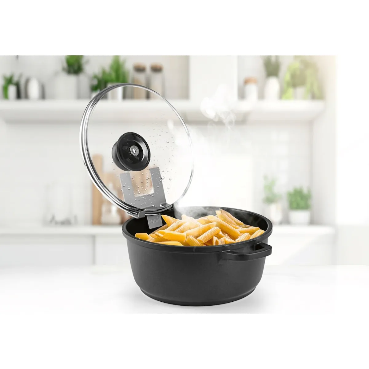 Die weichen, hitzebeständigen Silikonfüße sorgen für stabilen Halt und schützen Töpfe und Pfannen zuverlässig vor Kratzern. Der Halter ist passend für Deckel mit einem Durchmesser von 16 bis 30 cm, spülmaschinengeeignet und designt in Deutschland – für mehr Ordnung, Sauberkeit und Entspannung beim Kochen.