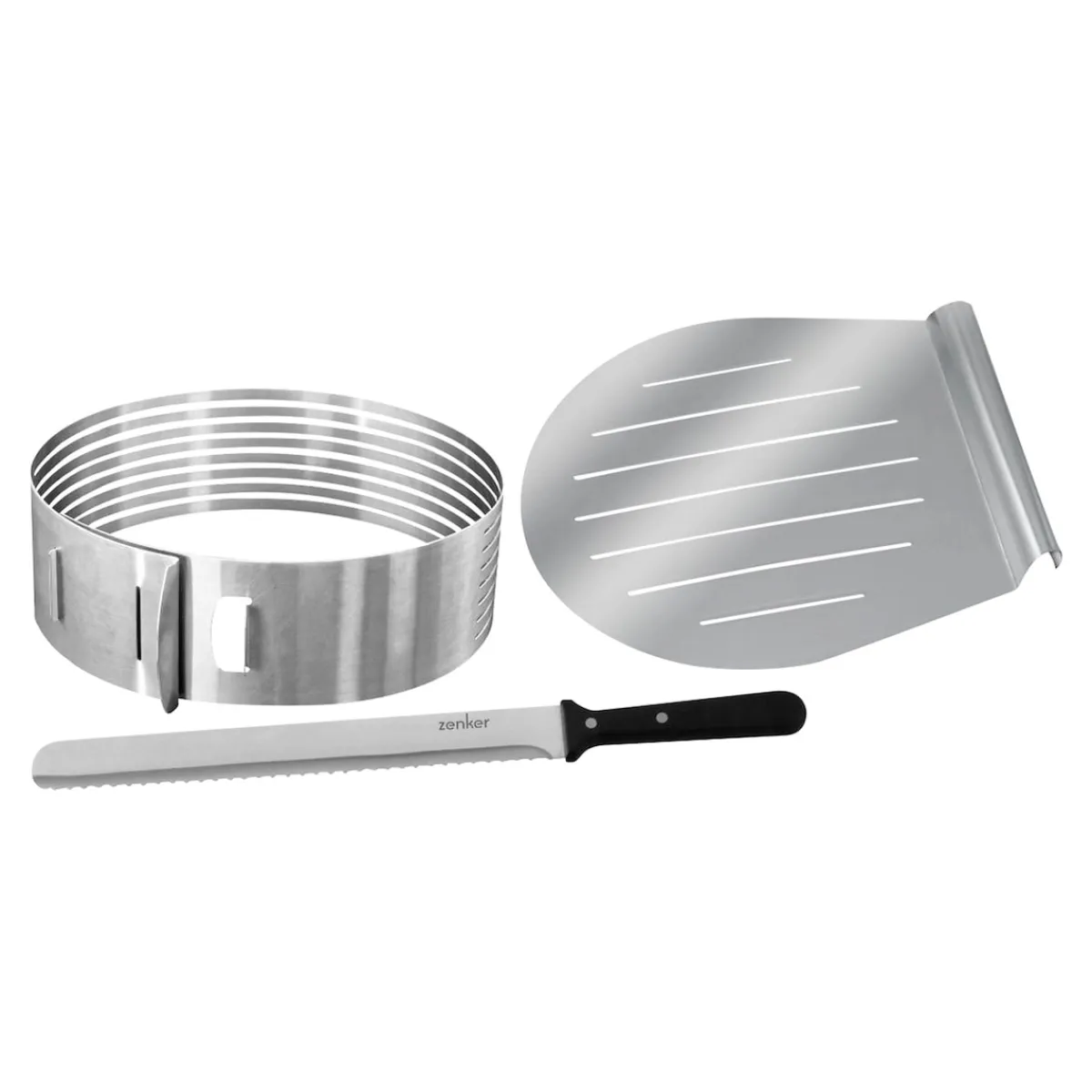 Von den Profis der Patisserie direkt in Ihre Küche: Das 3-teilige Tortenboden-Schneidehilfe-Set von Zenker hilft Ihnen, mehrschichtige Kuchen- und Tortenträume wie aus der Konditorei herzustellen. Es besteht aus einer Tortenboden-Schneidehilfe, einem Tortenhebeblech und einem Konditor-/Glasurmesser.