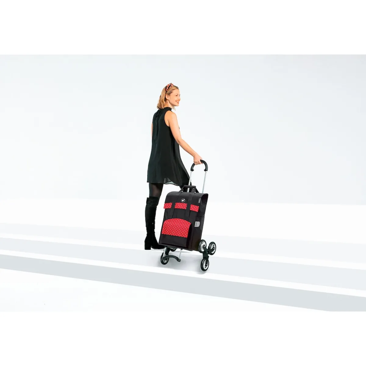 Durch die 3-fach-Räder lässt sich der Trolley mühelos Treppen hochziehen. Elegante Tasche aus textilem Material mit weißem Polka-Dot-Design. Griff abklappbar.