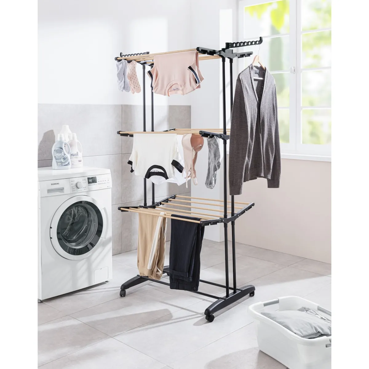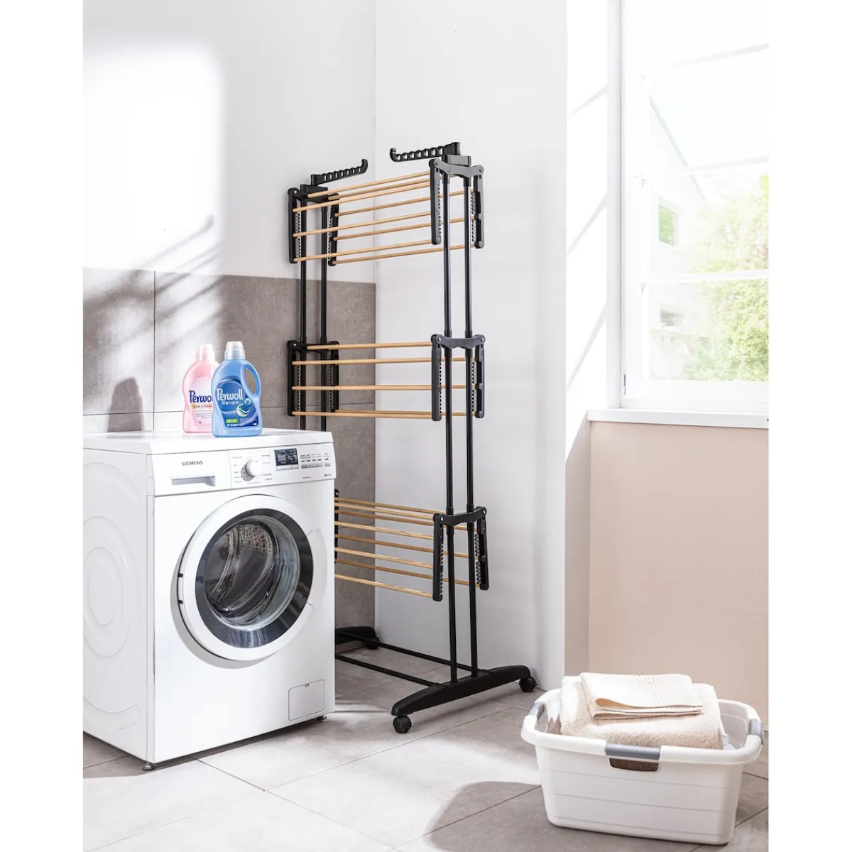 Dieser geniale Turmwäschetrockner ist extrem kompakt im Gebrauch und bietet auf 3 ausklappbaren Ebenen sowie 2 Seitenflügeln für Kleiderbügel viel Trockenplatz für Ihre Wäsche. Dank 360°-Rollen lässt er sich – auch voll beladen – leicht verschieben und platzsparend verstauen. Tipp für kleine Wohnungen: Er findet sogar in der Duschkabine Platz.