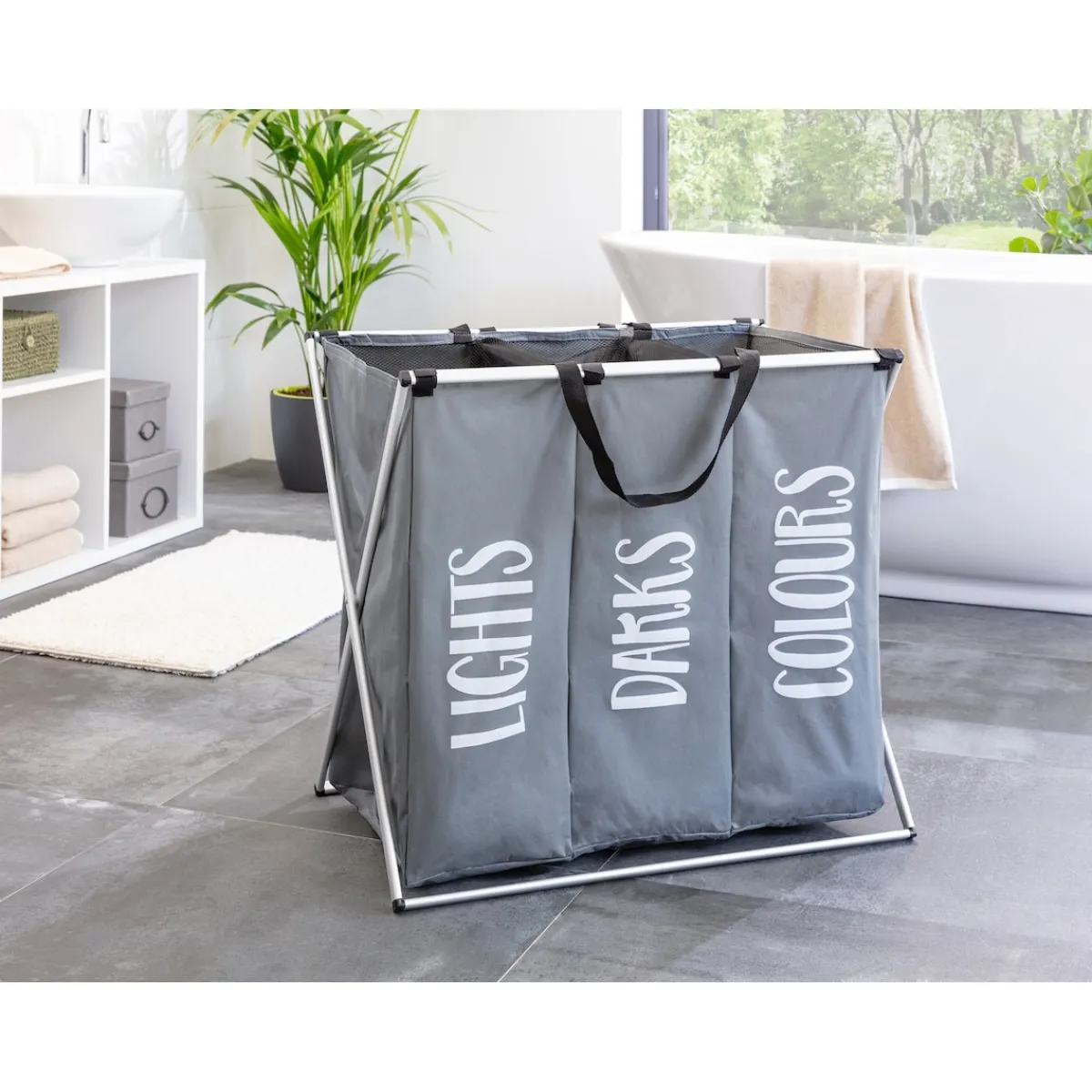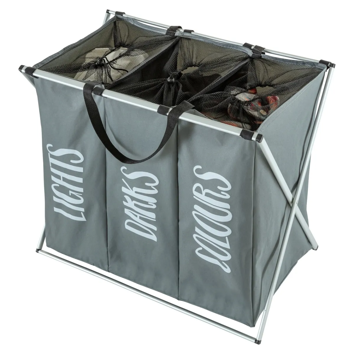Dieser praktische, platzsparende Sammler mit 3 geräumigen Wäschenetzen erleichtert Ihnen die Hausarbeit: Einfach die getragene Wäsche in das passende Fach für dunkle, helle oder bunte Wäsche einsortieren und in die Waschmaschine geben. Die Netze sind mit Zugverschluss verschließbar, von der Halterung abnehmbar und können problemlos mitgewaschen werden.