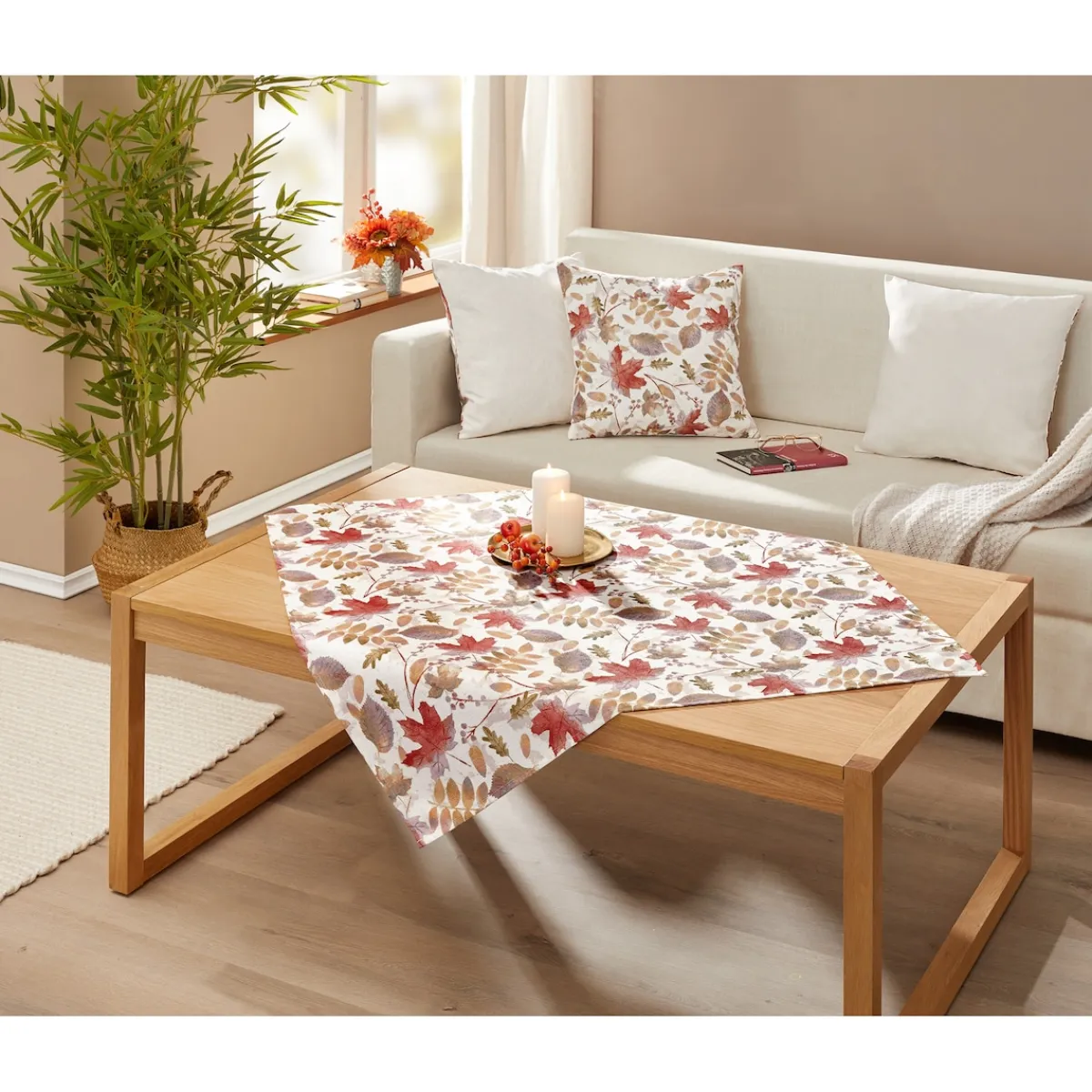 Mit dieser wendbaren Kissenhülle holen Sie sich die Farben und das Leuchten des Herbstes direkt ins Wohnzimmer. Die stilisierte Blätterpracht in Rot- und Brauntönen wird durch feine, goldene Fäden ergänzt, die je nach Lichteinfall dezent schimmern. Die Wendeoptik bietet Ihnen zwei Gestaltungsmöglichkeiten – ganz nach Stimmung und Einrichtung. Ob als saisonale Ergänzung oder dauerhaftes Wohnaccessoire: Diese Hülle bringt Eleganz und Gemütlichkeit in perfekte Balance.