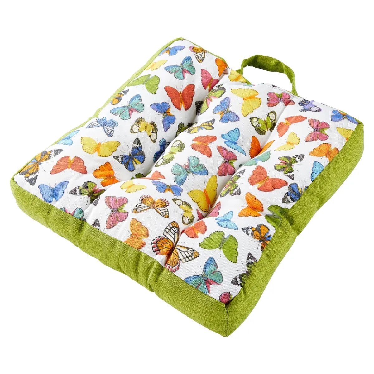 Schmetterlinge und Blumen machen dieses herrlich weiche, bequeme Kissen optisch zu einem echten Vergnügen! Mit unifarbener Rückseite und Tragegriff.