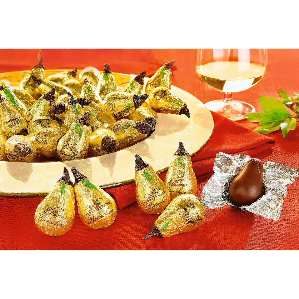 So „geistreich“ kann es sein, mal wieder Schokolade zu naschen! Williams-Birnchen mit einer Hülle aus edler Zartbitter-Schokolade, gefüllt mit hochprozentigem Williams-Birnenbrand.