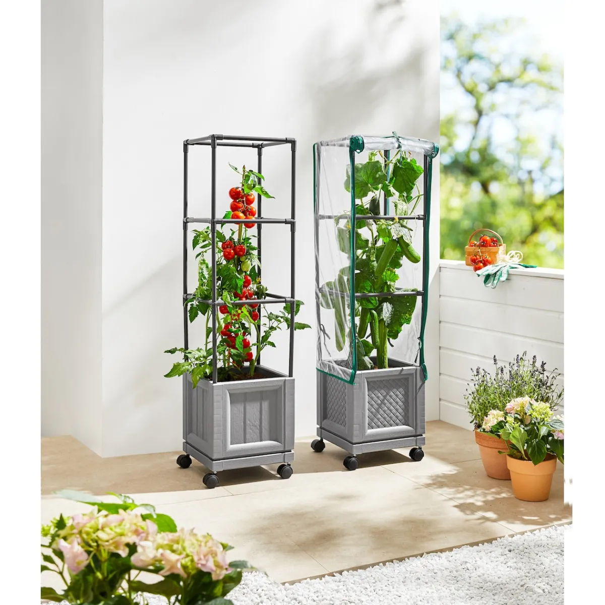 Erfüllen Sie sich Ihre eigenen Gemüse-Träume! Ziehen Sie köstliche Tomaten oder üppige Kletterpflanzen an den praktischen Rankhilfen heran. Dank seiner 2 Wendeplatten in geflochtener Rattan- und Holzbalkenoptik passen sich die Töpfe nicht nur schnell Ihren Wünschen an, sondern lassen sich auf 4 Rollen auch mühelos verschieben.